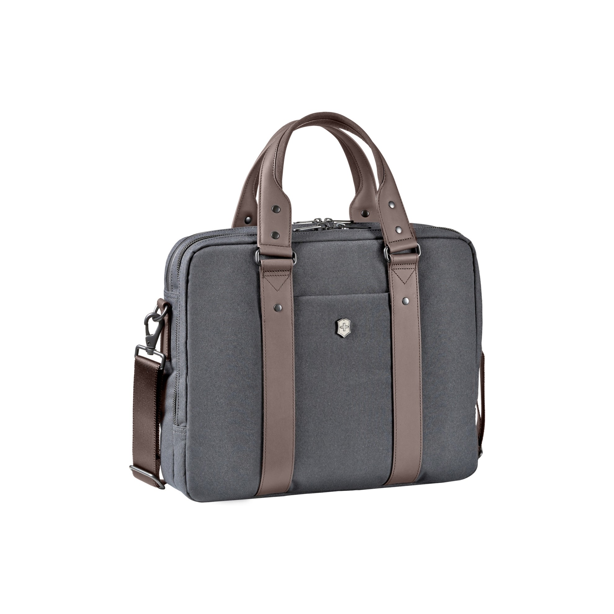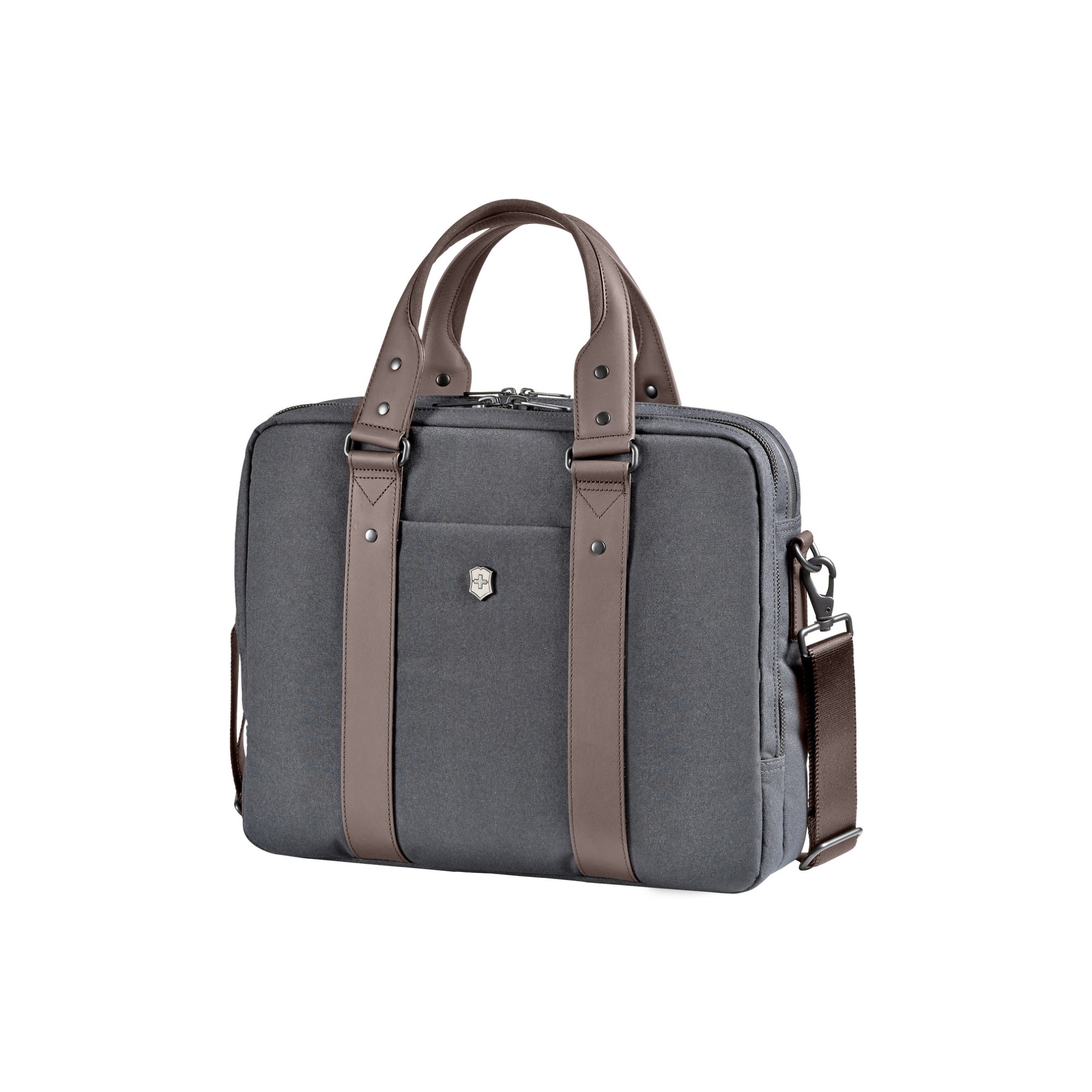 Aktovka z polyesteru v šedohnědém provedení s kapacitou 11 litrů.