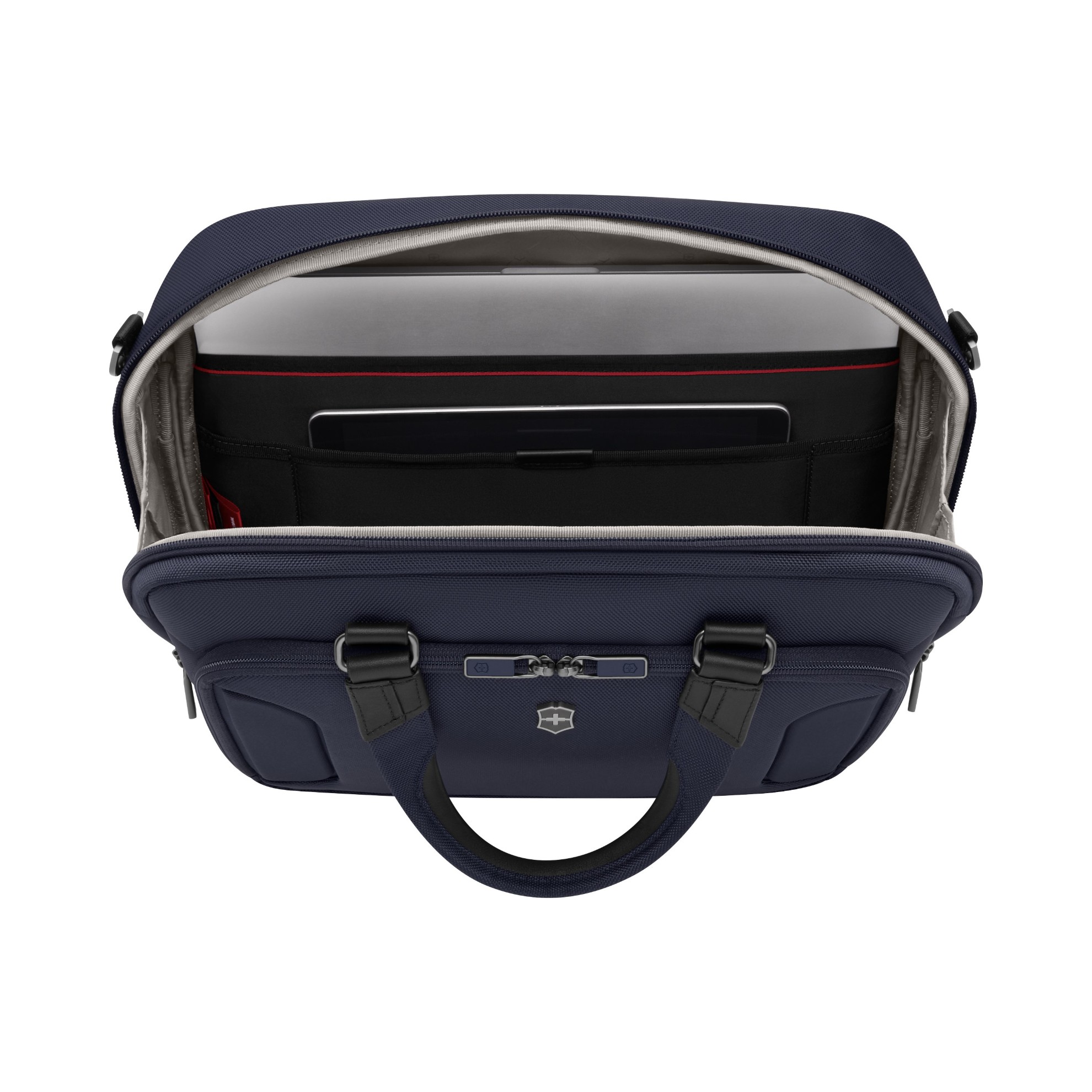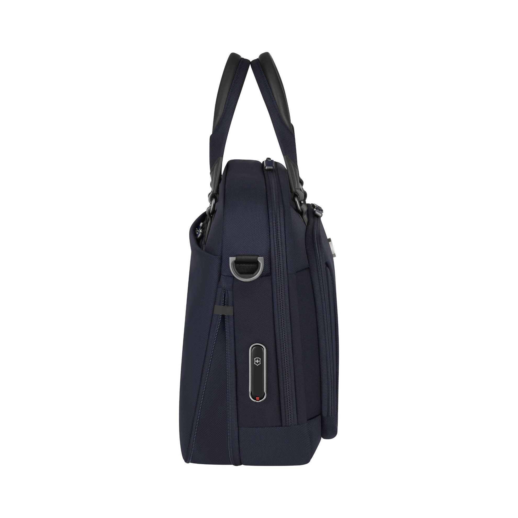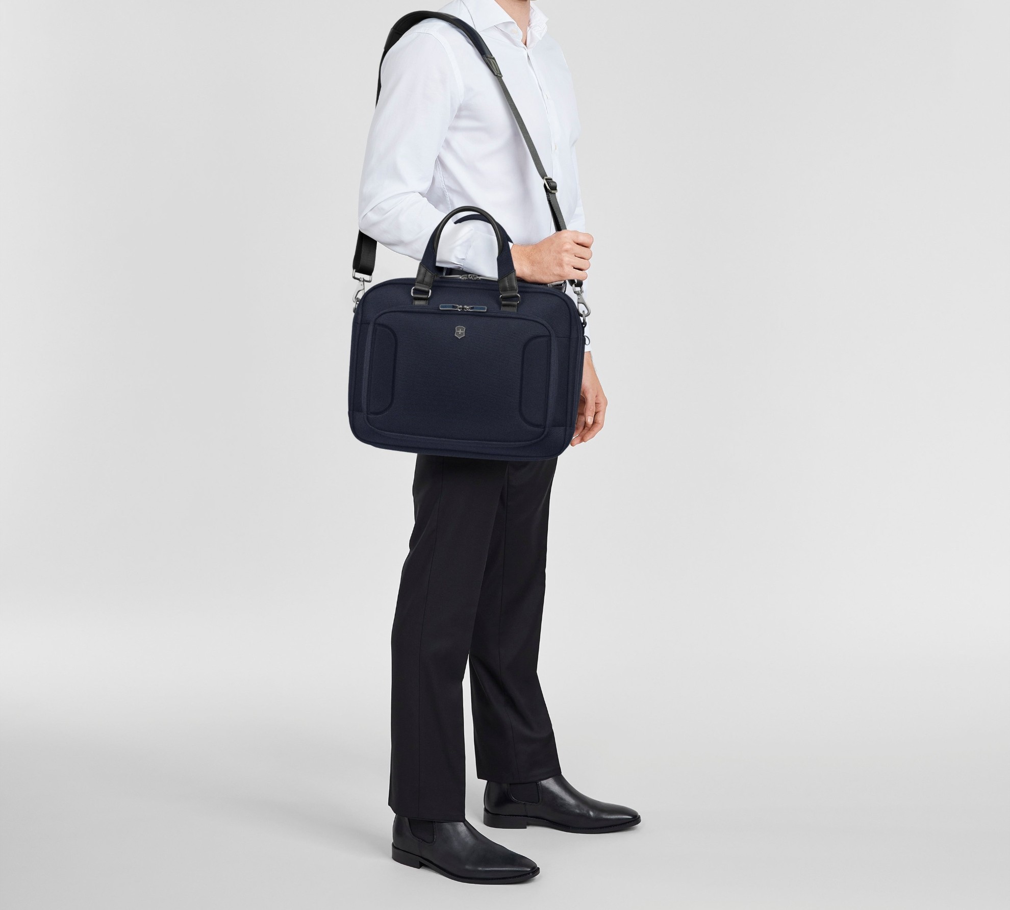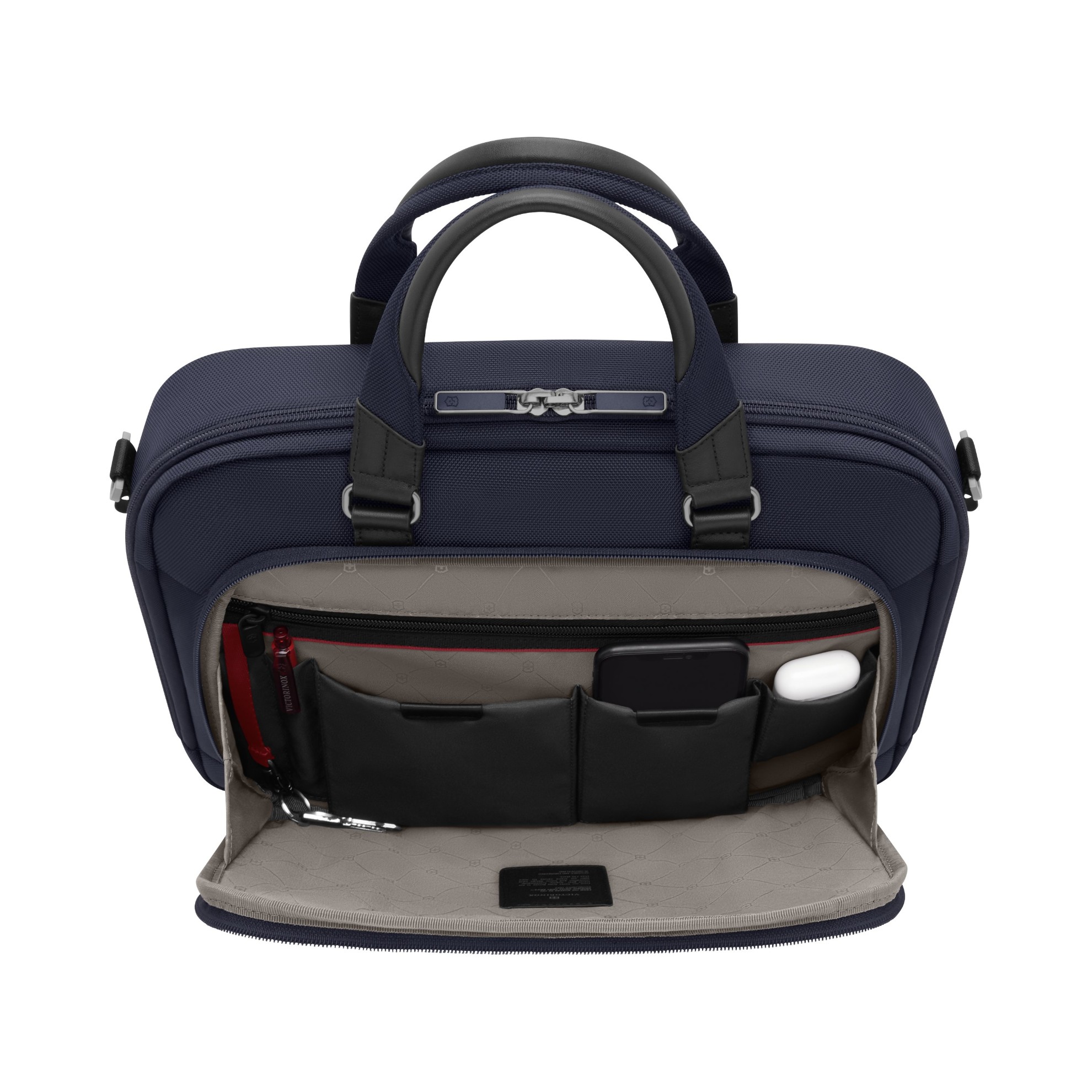 Praktická aktovka z recyklovaného polyesteru v modré barvě s černými koženými prvky a kapacitou 19 litrů s expanzním systémem, který umožnuje rozšířit kapacitu aktovky. Je možné v ní přepravit notebook do velikosti 14"/35,5 centimetrů.