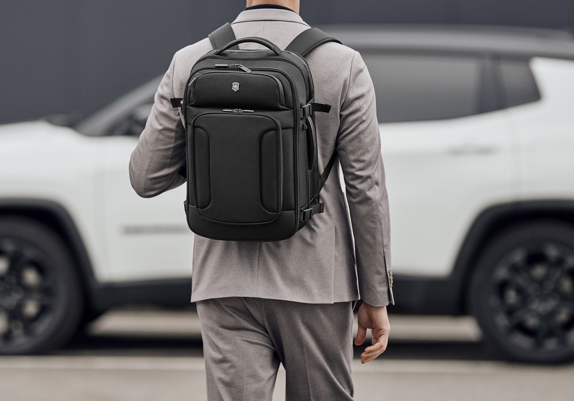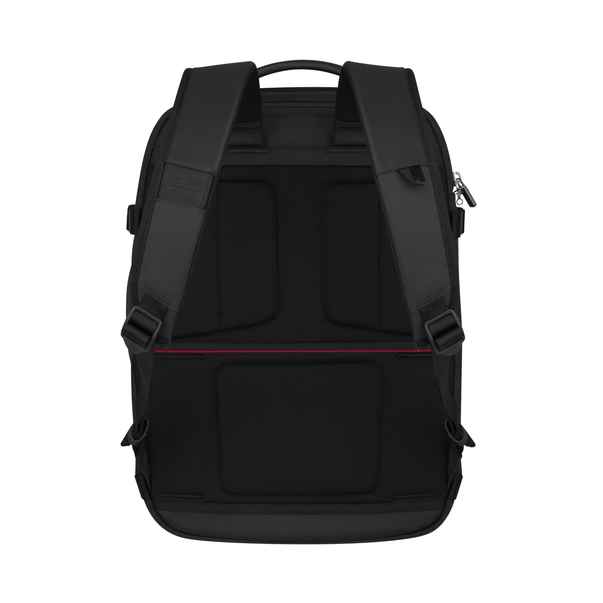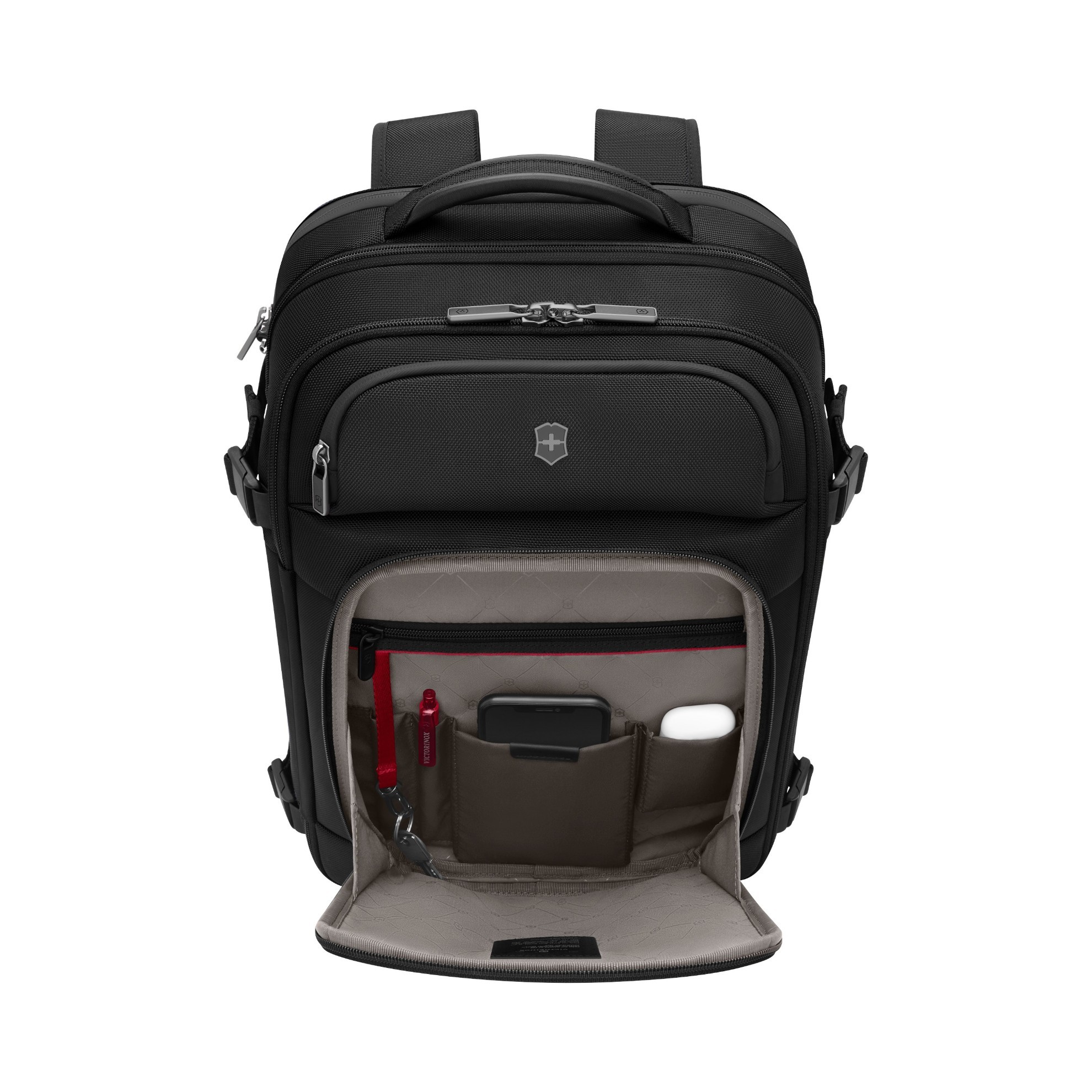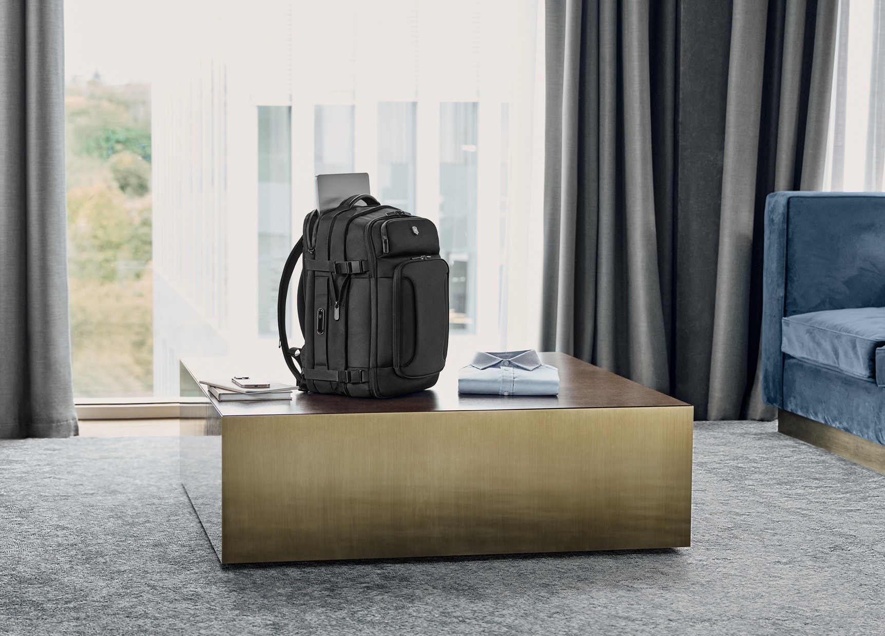 Praktický batoh z recyklovaného polyesteru s koženými prvky v černé barvě s kapacitou 27 litrů s expanzním systémem, který umožnuje rozšířit kapacitu batohu na 32 litrů.