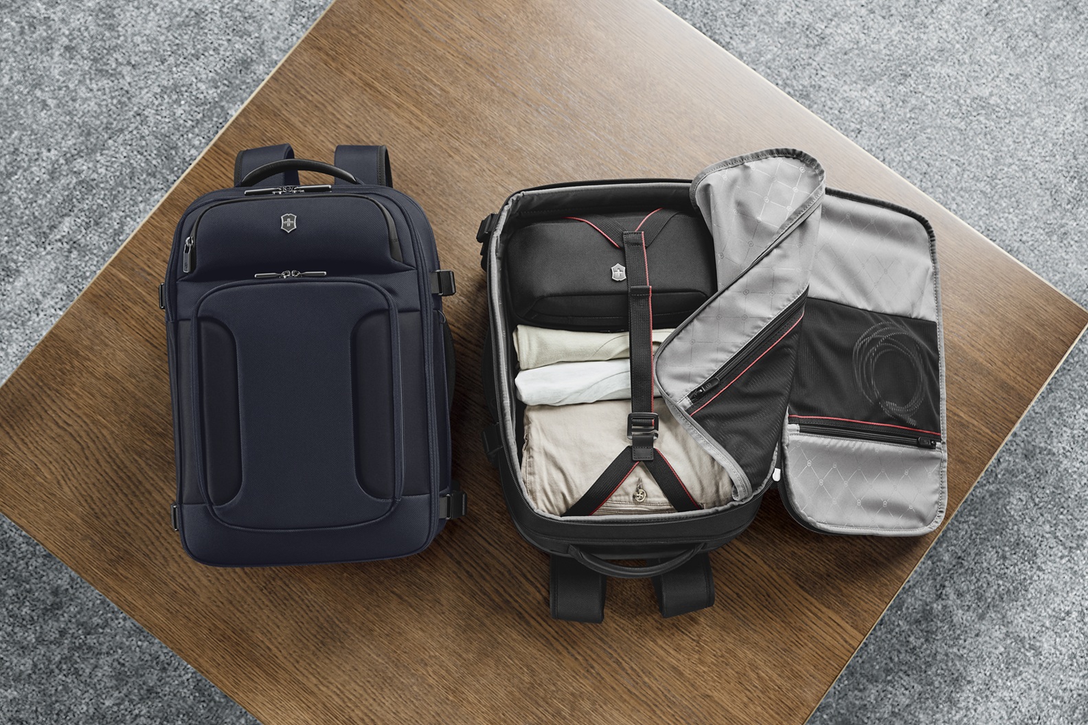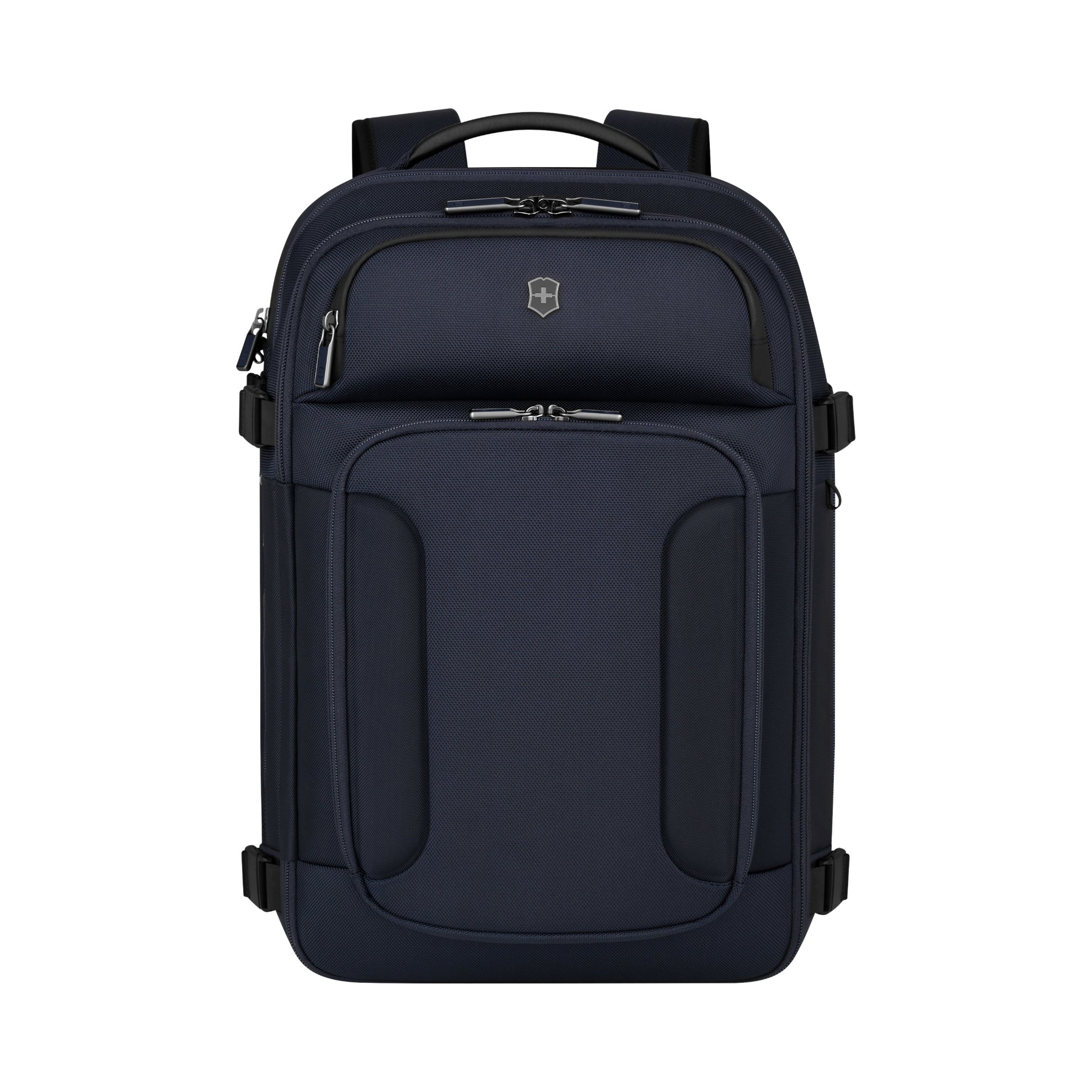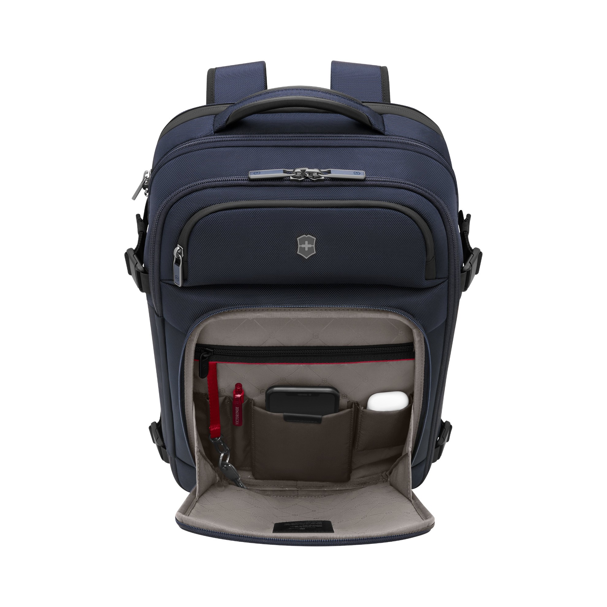 Praktický batoh z recyklovaného polyesteru v modré barvě s černými koženými prvky a kapacitou 27 litrů s expanzním systémem, který umožnuje rozšířit kapacitu batohu na 32 litrů.