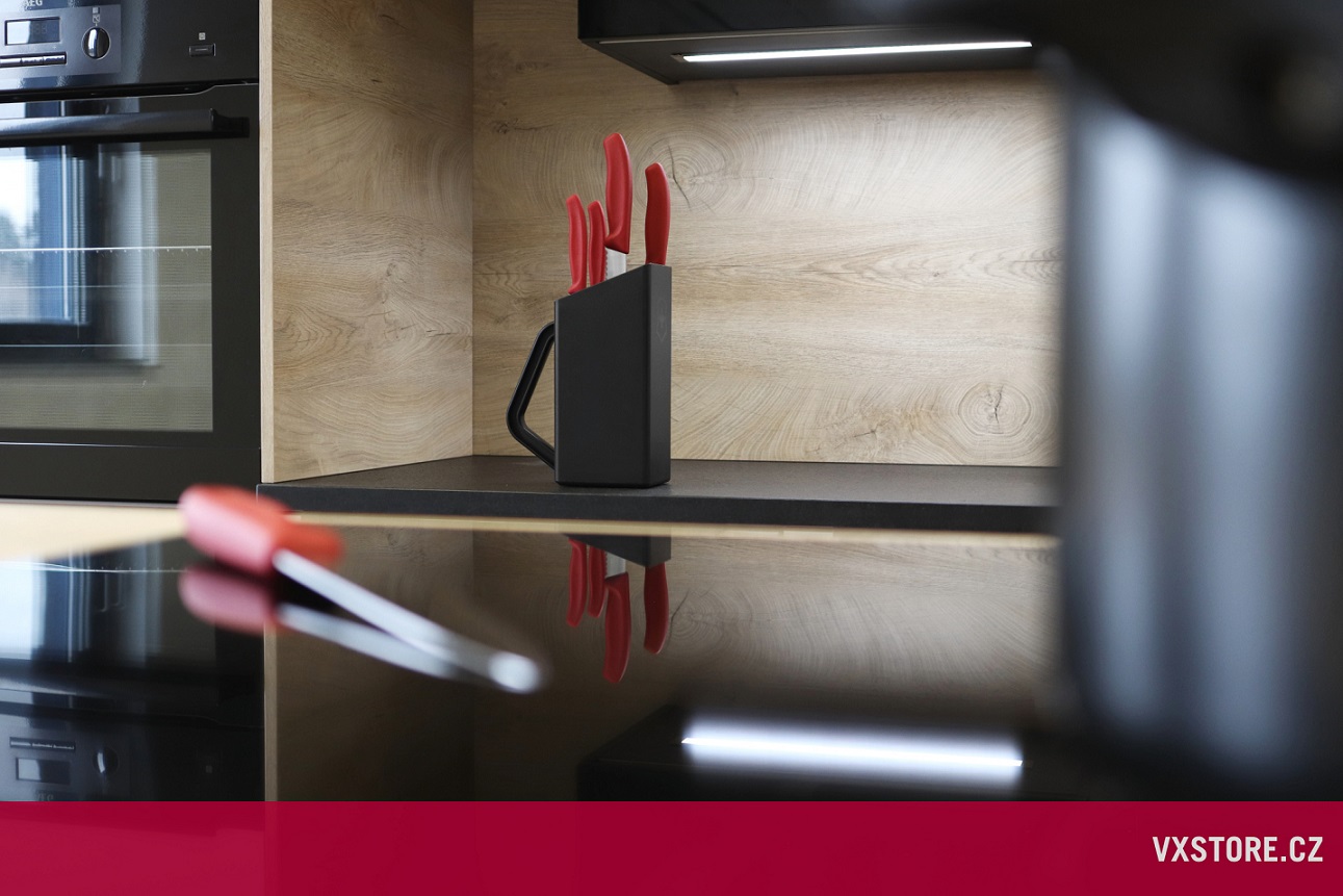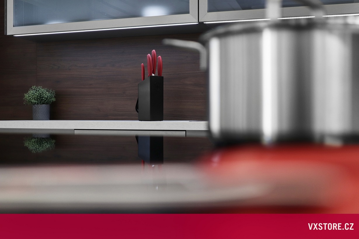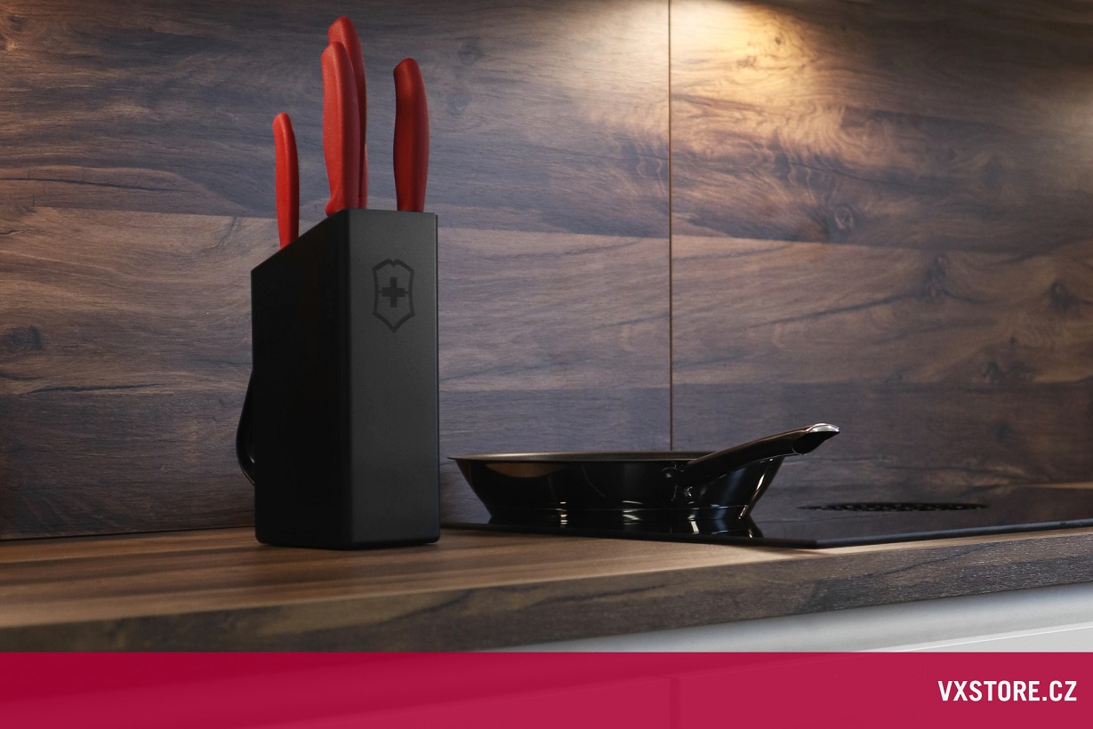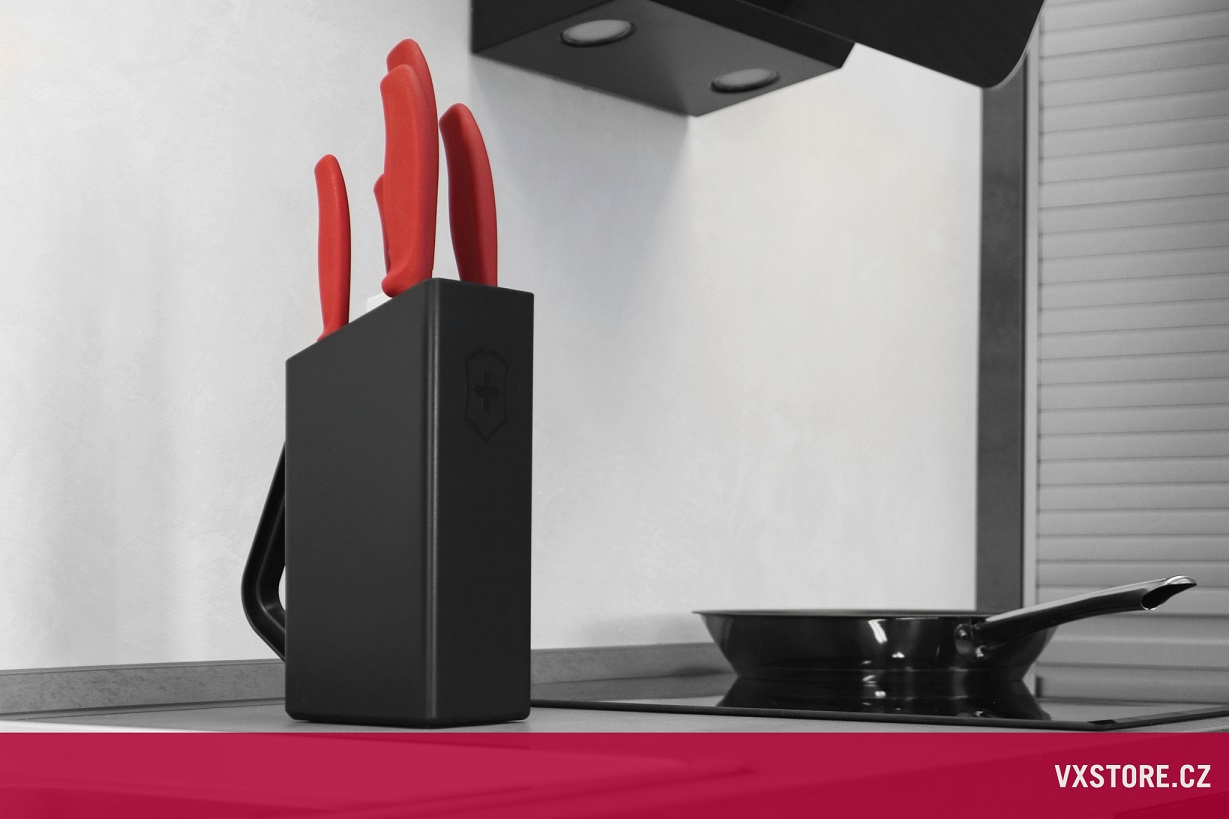Blok na nože z polyamidu s nylonovými štětinami v černém provedení vhodný do každé domácnosti. Nože mají rukojeť z termoplastu a čepele z nerezové oceli.