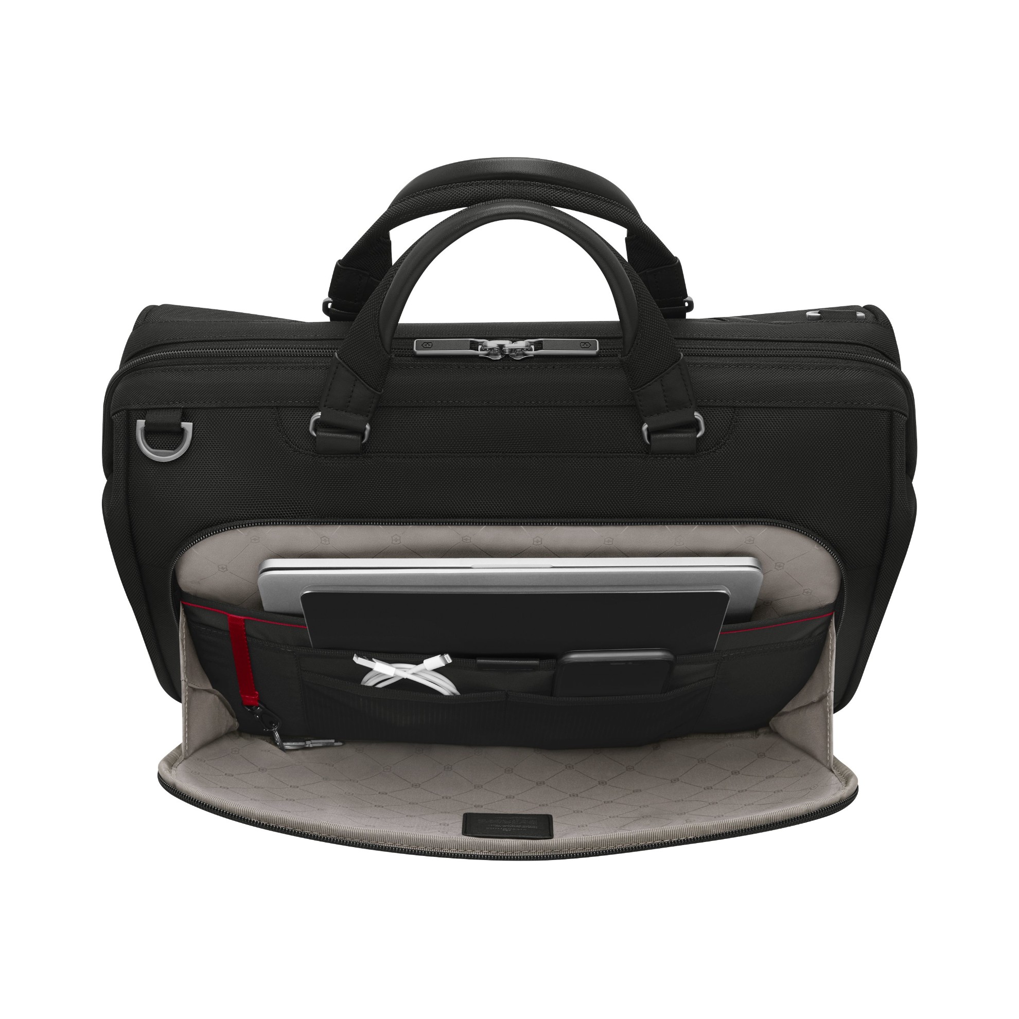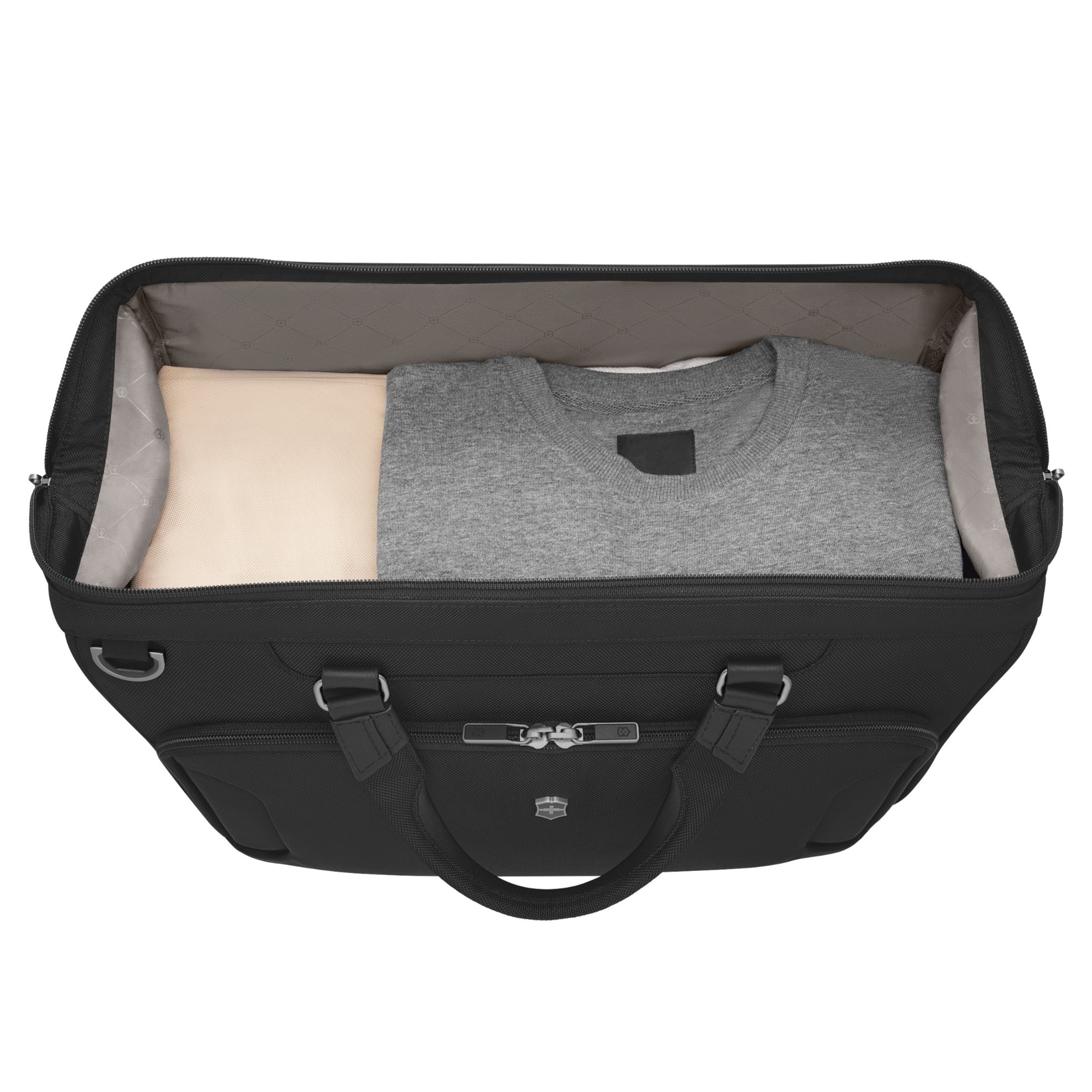 Praktická cestovní taška z recyklovaného polyesteru v černé barvě s koženými prvky a kapacitou 44 litrů s expanzním systémem, který umožnuje rozšířit kapacitu tašky. Je možné v ní přepravit notebook do velikosti 14"/35,5 centimetrů.