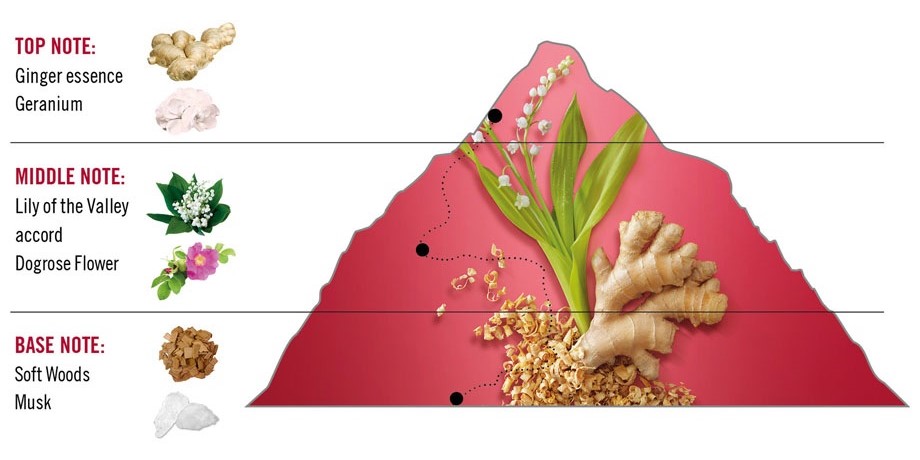 Povzbuzující vůně Swiss Army For Her Ginger Lily překypuje energií a chutí do života, evokuje sebevědomí. Jiskřivé tóny zázvorové esence se mísí s akcenty bylinné pelargónie. Jádro tvořené akordem orosené konvalinky za jasného jarního rána vyzařuje květinovou svěžest, která se prolíná s jemným sladkým nádechem červenajících se okvětních lístků růže. Tóny měkkého dřeva a bílého pižma připomínající kůži zanechávají neobvykle poutavou stopu.