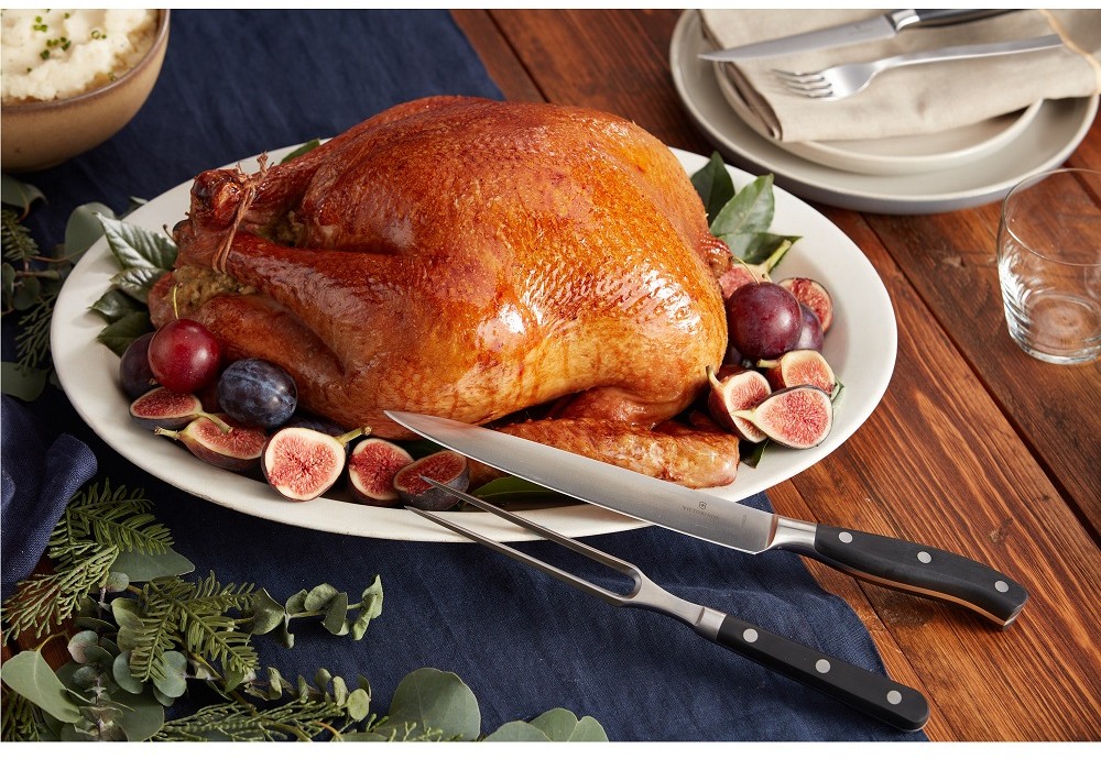 Dranžírovací sada složená z kovaného nože s délkou čepele 20 centimetrů a kované vidličky, jejichž rukojeti jsou vyrobené z polyoxymetylenu.