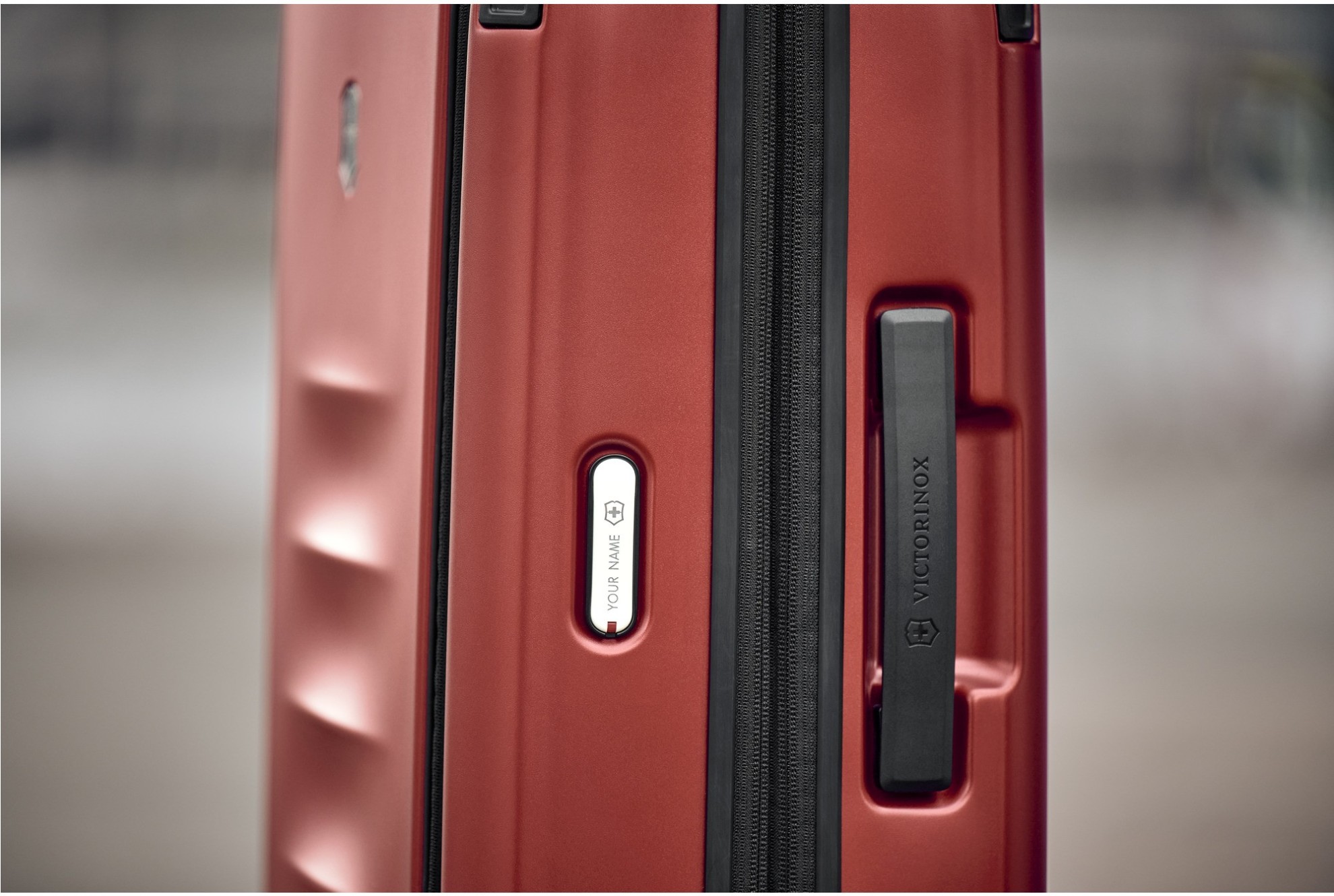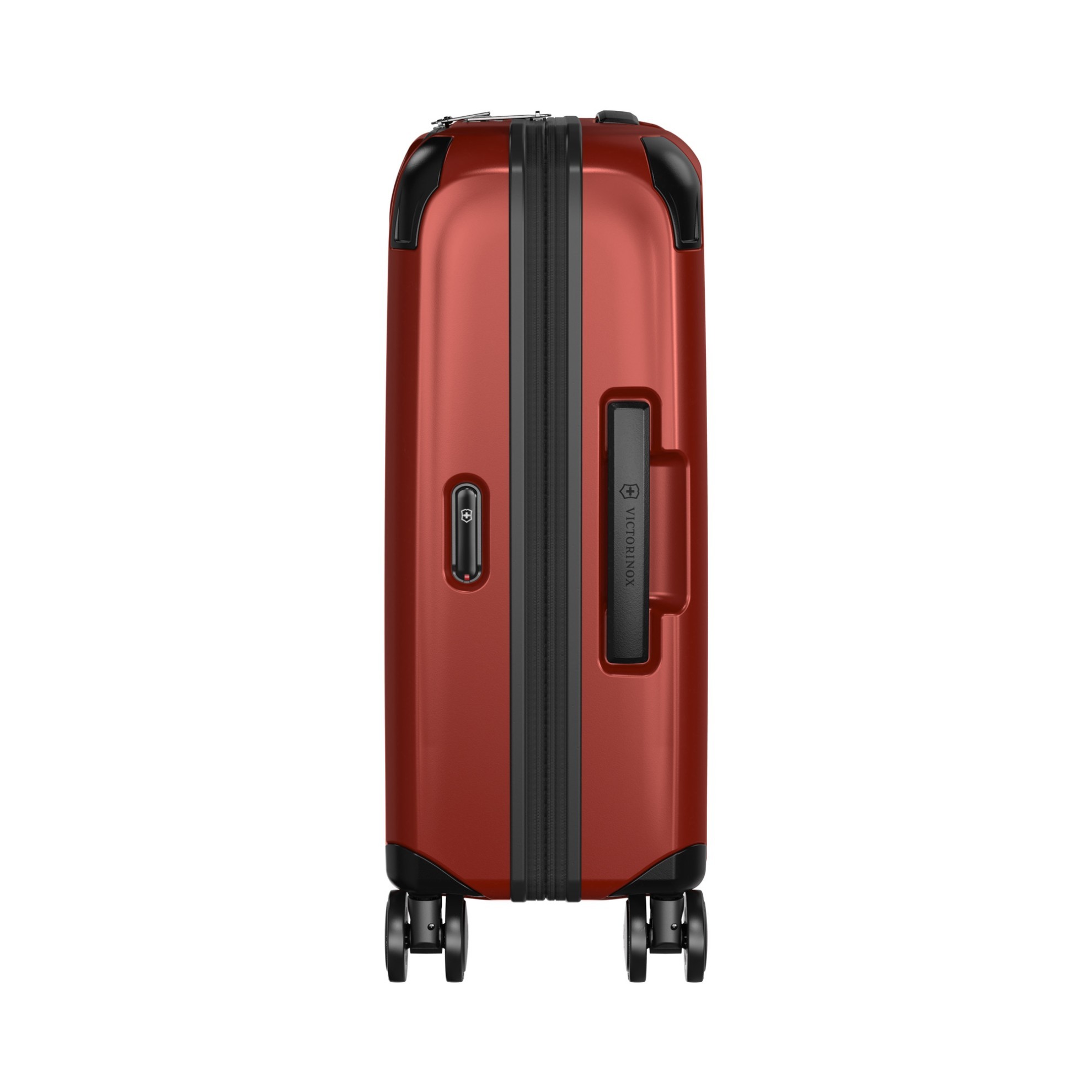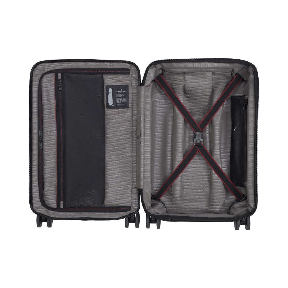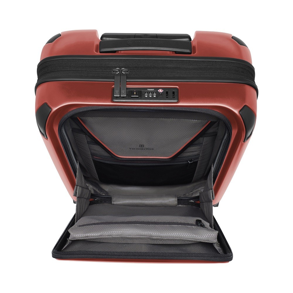 Odolné kabinové zavazadlo z polykarbonátu v červené barvě s kapacitou 39 litrů s expanzním systémem se zipem, který umožnuje rozšířit kapacitu zavazadla na 47 litrů.