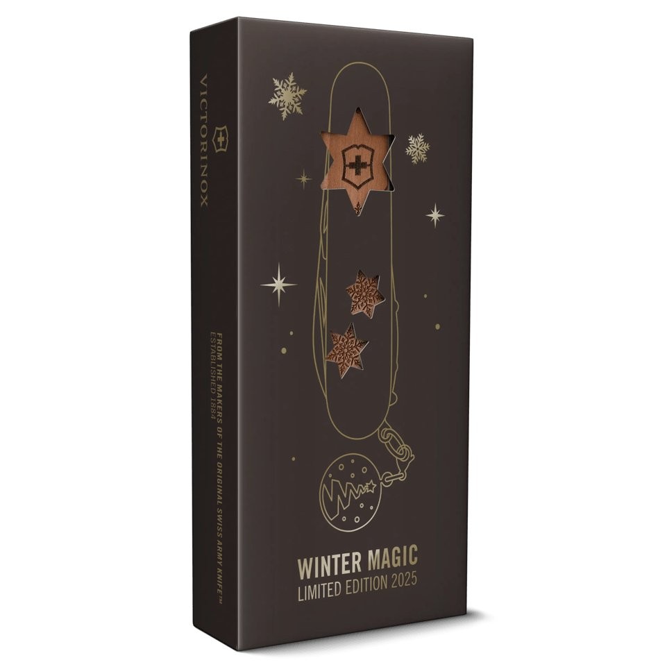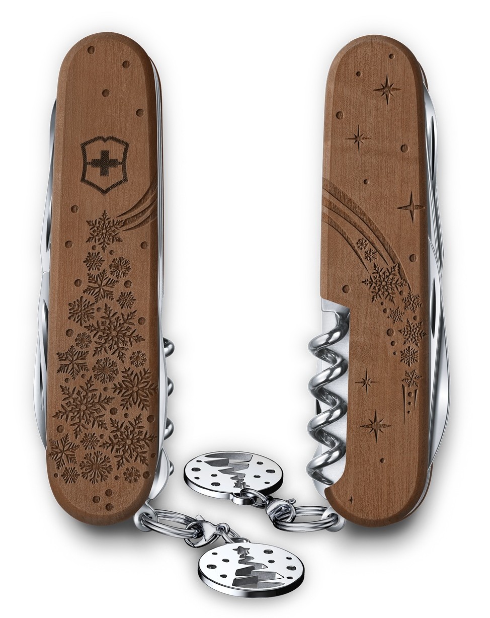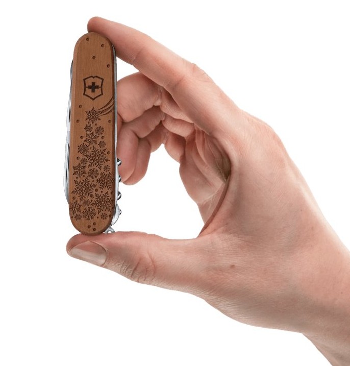 Kapesní nůž Victorinox o velikosti 91 milimetrů se zimním motivem na dřevěné střence vybavený 17 funkcemi. Jedná se o limitovanou edici v počtu 10000 kusů.