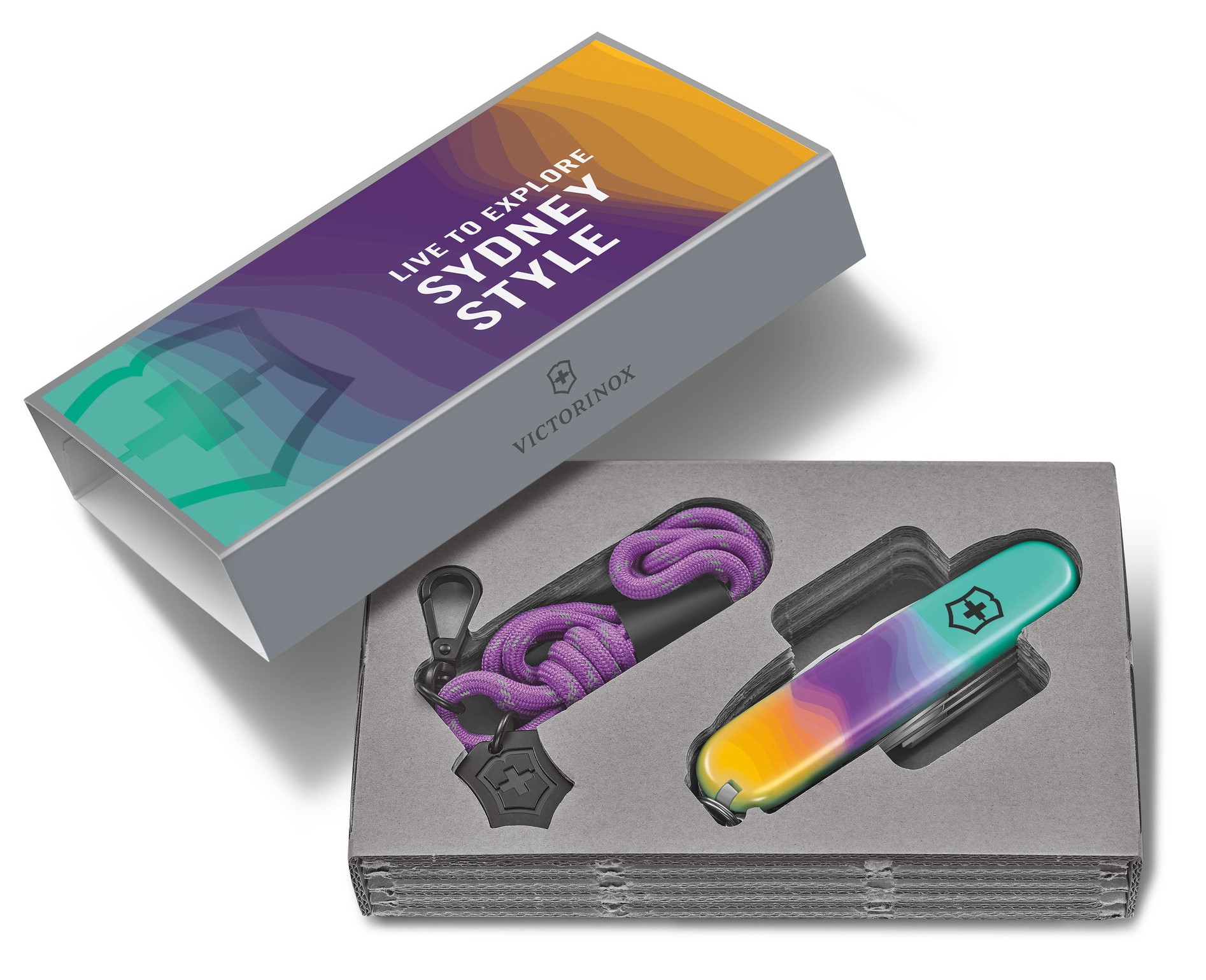 Kapesní nůž Sydney Style z kolekce Live to Explore spojuje křehkou ženskost s kompaktní funkčností a ztělesňuje dynamiku a vzrušení. Nůž je doplněn šňůrkou na krk s karabinkou a přívěskem ve tvaru loga s typickým švýcarským křížem, vše společně uloženo v elegantní dárkové krabičce. Nůž samotný je vybaven 16 praktickými funkcemi, včetně nové inovativní funkce pro snadné a bezpečné otevírání krabic: