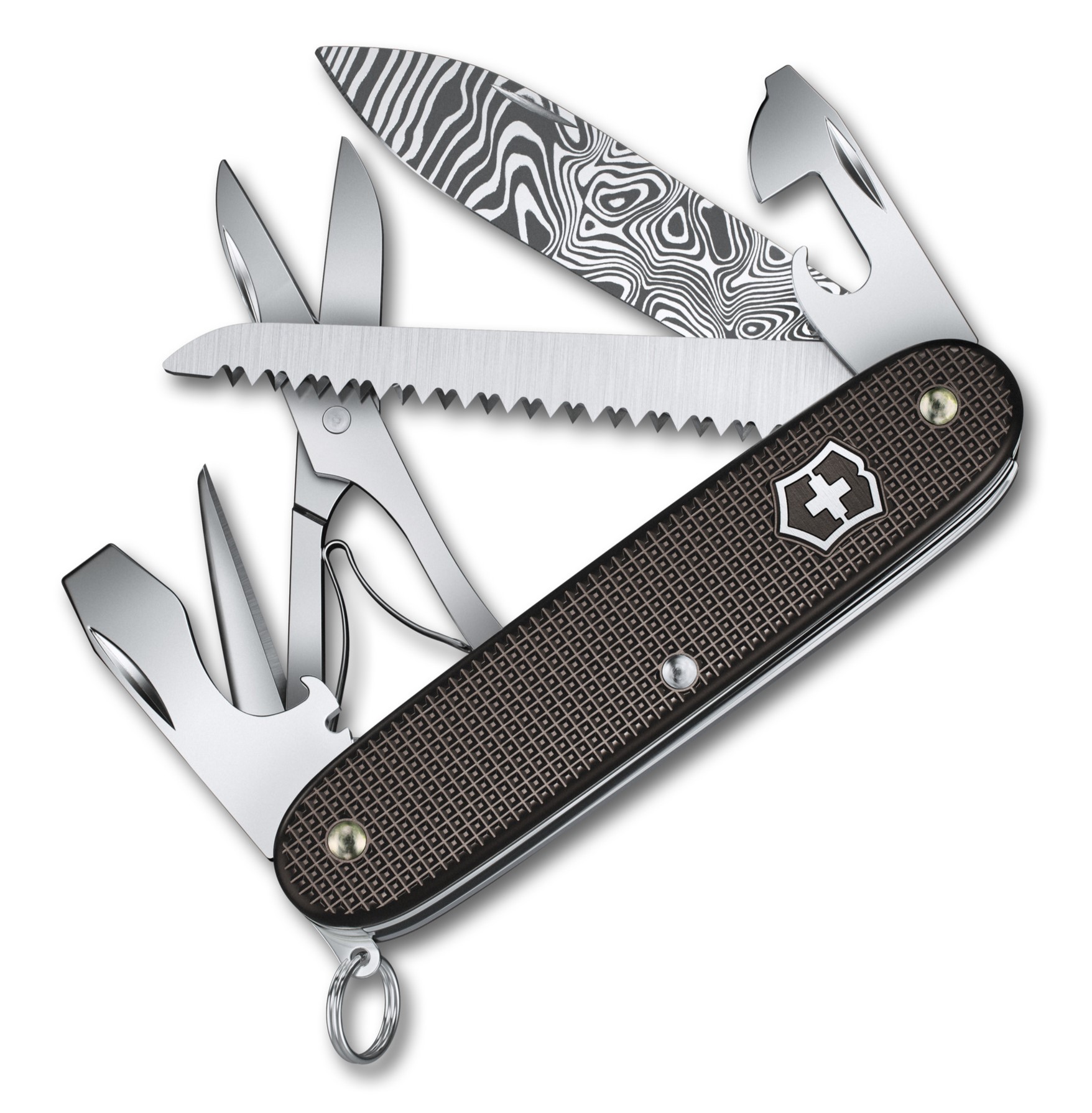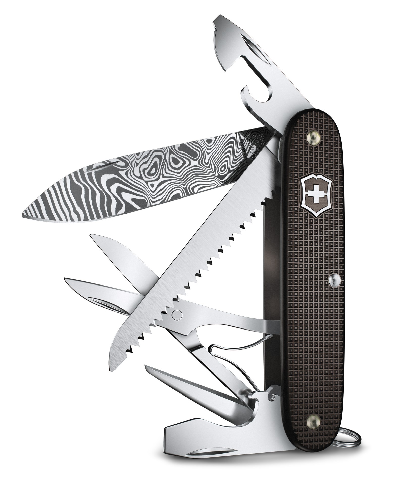 Letošní limitovaná edice Damast je fascinujícím spojením nože Victorinox Farmer X, oblíbených střenek Alox v syté tmavě hnědé barvě a elegantní čepele Damasteel®. Je celosvětově omezena na 7000 kusů. Čepel Damasteel®, vyrobená ve 115 vrstvách pro neuvěřitelnou houževnatost, nese charakteristický vzor Hakkapella. V kombinaci se sytě hnědými střenkami Alox je tento číslovaný nůž naprosto unikátním elegantním doplňkem, stejně tak i plnohodnotným nástrojem vybaveným 10 funkcemi.