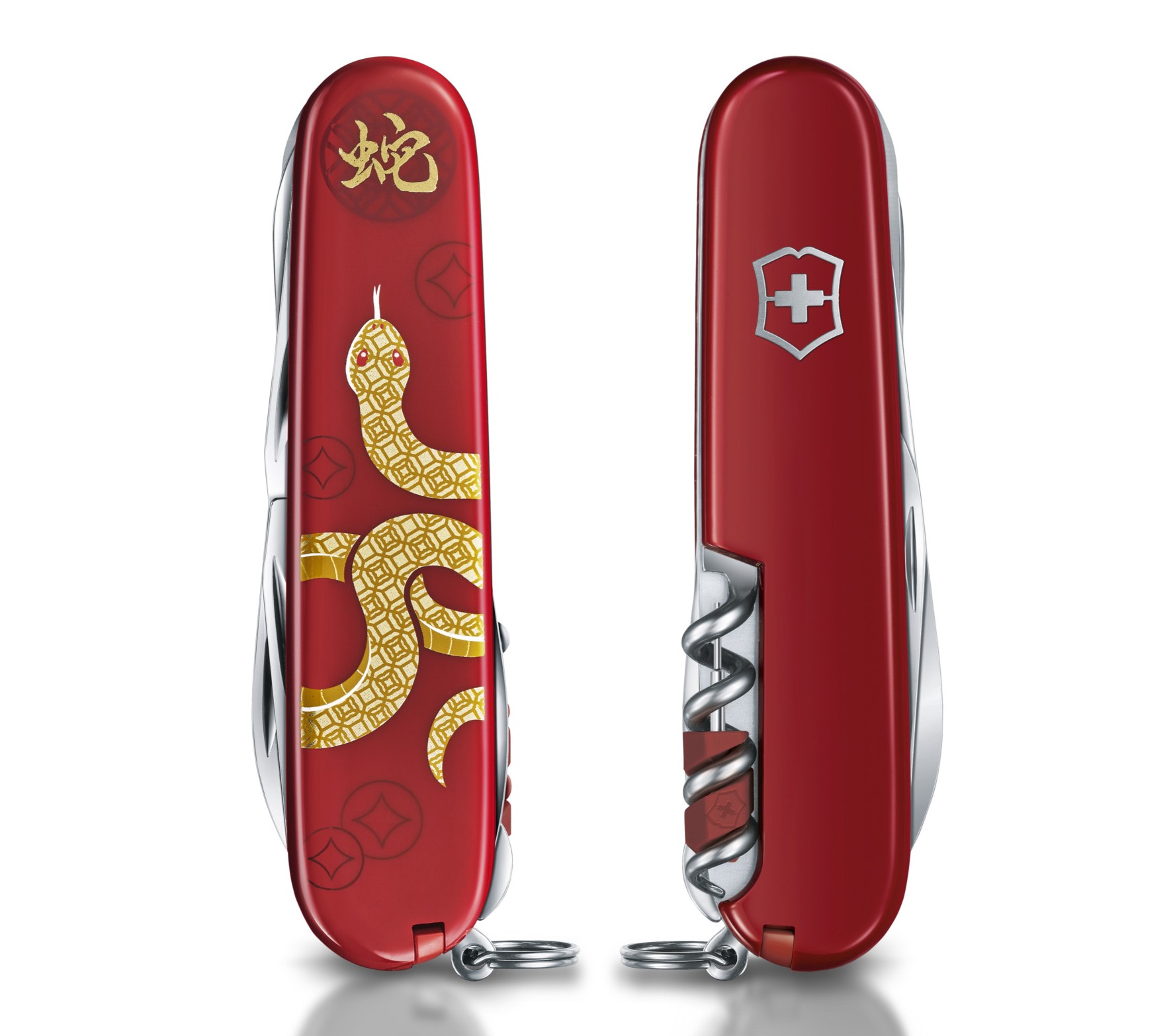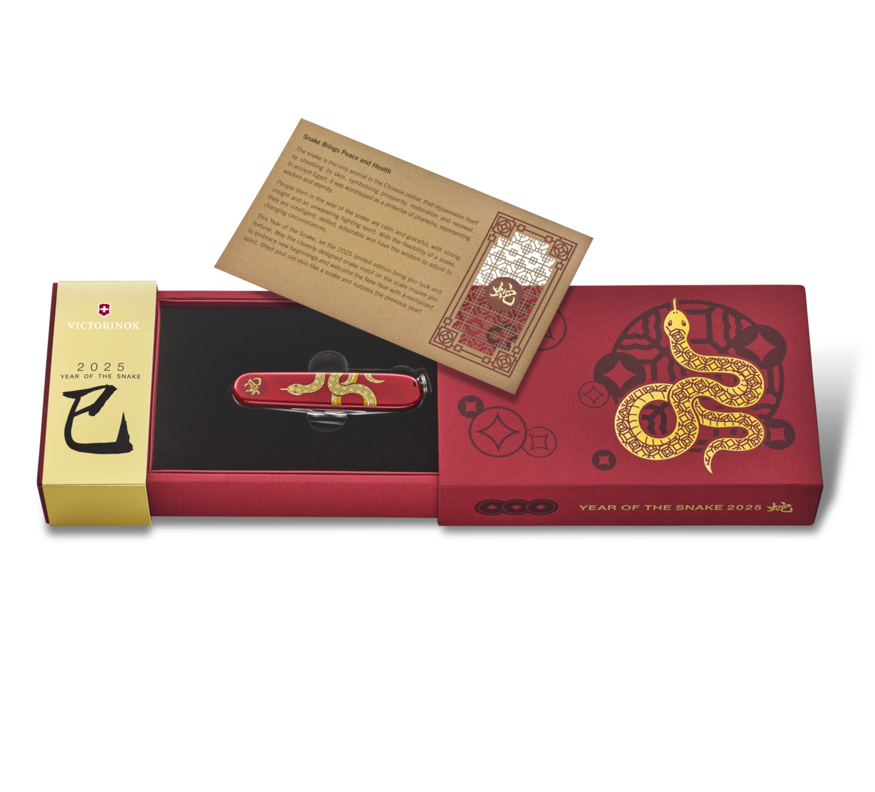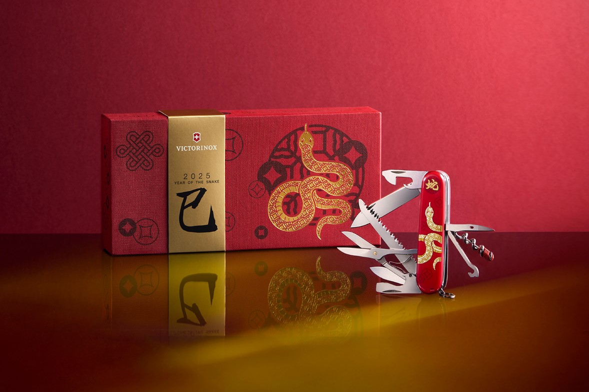 I pro rok 2025 přináší Victorinox sběratelský nůž Huntsman z limitované řady dekorované symboly znamení čínského zvěrokruhu. Tentokrát ve znamení hada, šestému znamení čínského věrokruhu. Každý nůž je individuálně očíslován, dodáván v luxusní dárkové krabičce, na které je vyobrazen Mystický uzel (如意), klasický symbol Feng Shui pro ochranu, hojnost a štěstí a je zdobená starobylou měděnou mincí (銅錢), která symbolizuje příští úspěšný rok. Součástí balení je také certifikát, a proto je tento kapesní nůž dokonalý dárek pro ty, kteří se narodili v čínském roce hada. Ostatní si jej zamilují pro úžasný design a dokonalé funkce. Jedná se o jedinečný sběratelský nůž s 16 funkcemi, který symbolizuje, stejně jako znamení hada, prosperitu, štěstí a oživení. Nůž je vyroben se švýcarskou precizností a obsahuje slovo „Snake“ v kurzivním písmu a starobylé měděné mince, které představují tělo hada. Bylo vyrobeno pouze 6000 kusů pro celý svět.