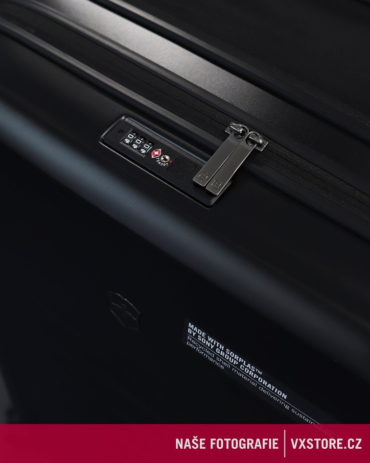 Odolné zavazadlo k odbavení z polykarbonátu v černé barvě s kapacitou 103 litrů s expanzním systémem se zipem, který umožnuje rozšířit kapacitu zavazadla na 143 litrů.