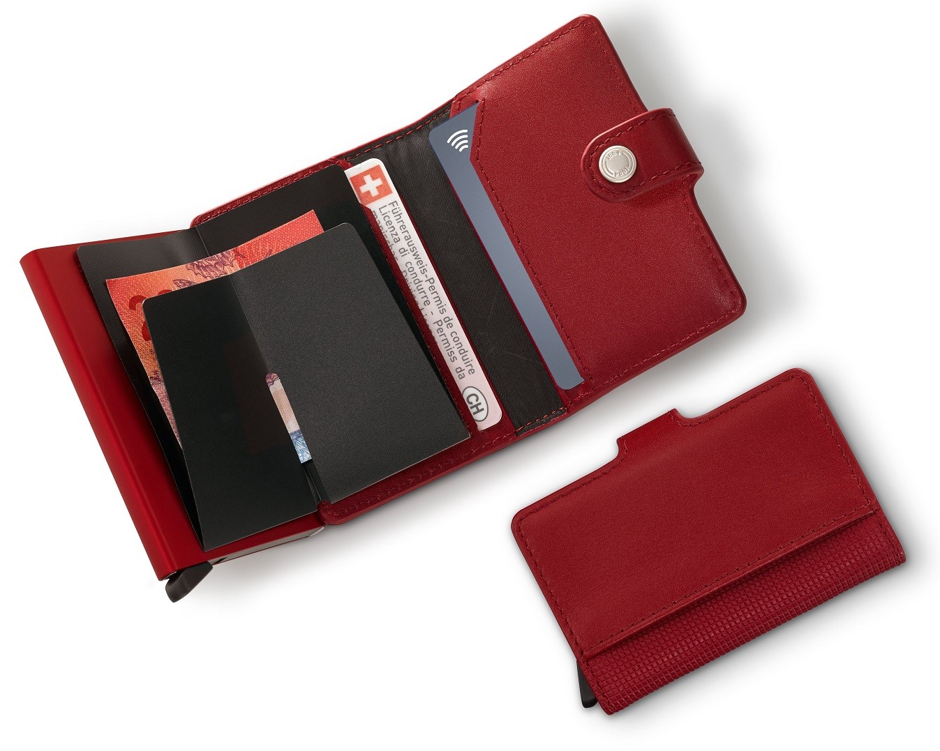 Co vznikne spojením inovací a technických znalostí společnosti Victorinox s oceňovaným designem holanské společnosti Secrid? Elegantní a dobře zpracovaná odpověď na rostoucí trend bezhotovostních plateb, menších peněženek a zabezpečení karet. Kožená mini peněženka má kompaktní rozměry a zároveň překvapivě velkou úložnou kapacitu. Jejím základem je pevné hliníkové pouzdro, které chrání vaše karty před ohnutím a proti digitálnímu zneužití díky RFID ochraně. Patentovaný mechanismus umožňuje vysunout karty jedním jednoduchým pohybem a umožní tak rychlý přístup k vašim kartám bez otevírání peněženky.