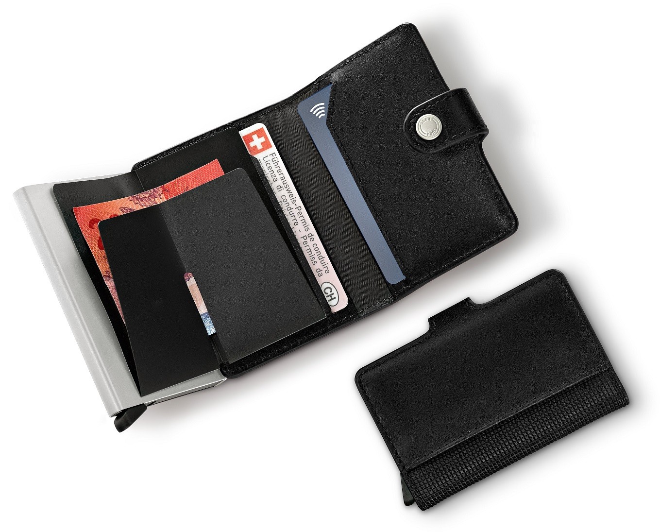 Co vznikne spojením inovací a technických znalostí společnosti Victorinox s oceňovaným designem holanské společnosti Secrid? Elegantní a dobře zpracovaná odpověď na rostoucí trend bezhotovostních plateb, menších peněženek a zabezpečení karet. Kožená mini peněženka má kompaktní rozměry a zároveň překvapivě velkou úložnou kapacitu. Jejím základem je pevné hliníkové pouzdro, které chrání vaše karty před ohnutím a proti digitálnímu zneužití díky RFID ochraně. Patentovaný mechanismus umožňuje vysunout karty jedním jednoduchým pohybem a umožní tak rychlý přístup k vašim kartám bez otevírání peněženky.