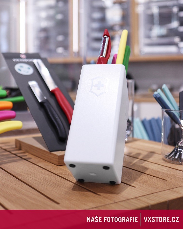 Blok na nože z polyamidu s nylonovými štětinami v bílo-černém provedení vhodný do každé domácnosti.