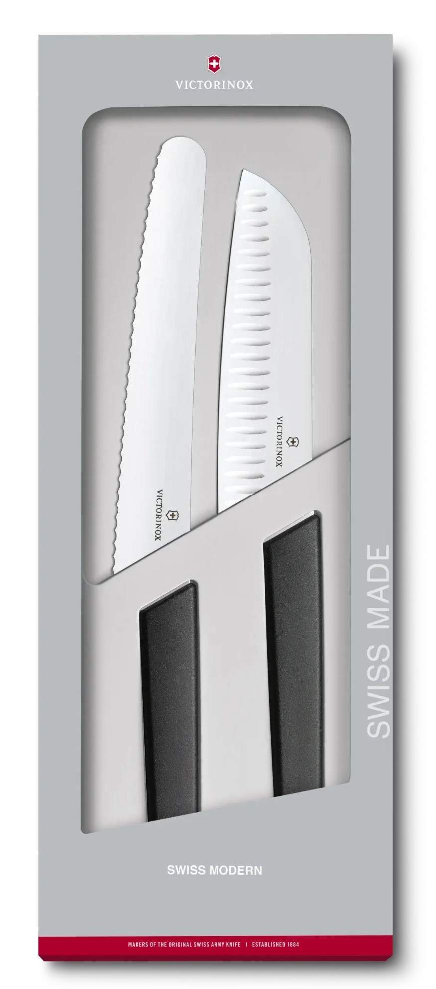 Sada obsahuje nůž na pečivo s vlnkovanou čepelí dlouhou 22 centimetrů a nůž Santoku s ostřím o délce 17 centimetrů s dutým výbrusem.