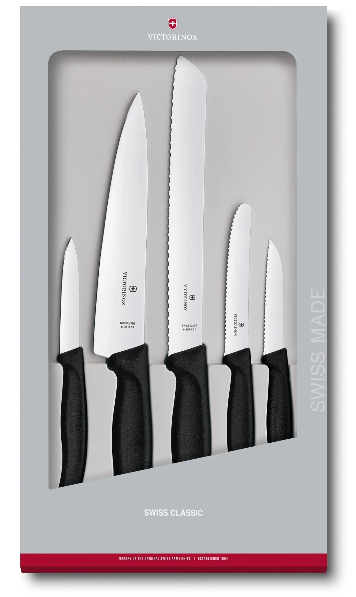 Sada s černými ergonomickými rukojeťmi a ocelovými čepelemi obsahující celkem 6 nožů: