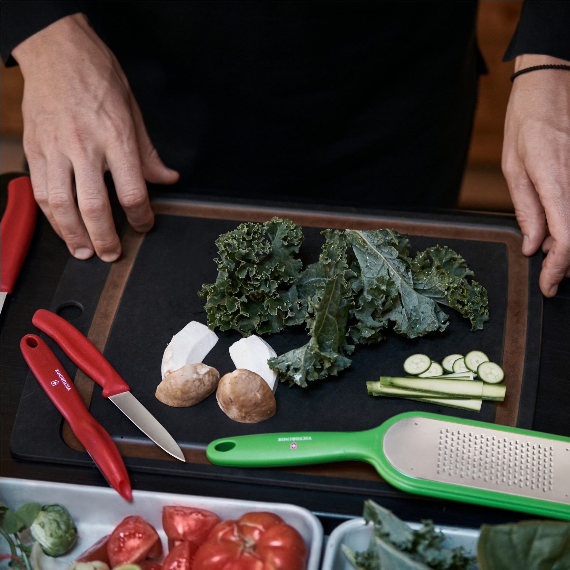 • loupací špičatý nůž s délkou čepele 8 cm• nůž na zeleninu s vlnkovanou čepelí o délce 11 cm• škrabku na ovoce a zeleninu