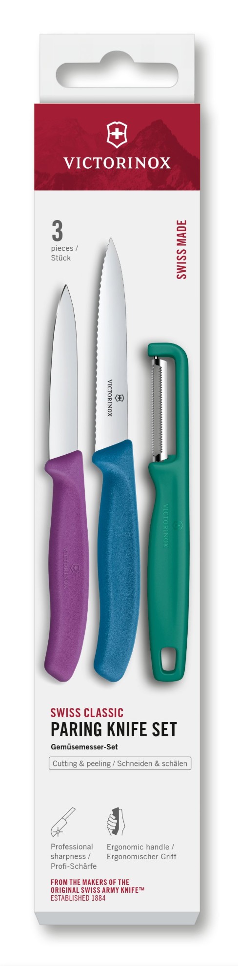 • univerzální kuchyňský nůž s fialovou rukojetí z polypropylenu a rovnou čepelí dlouhou 8 cm