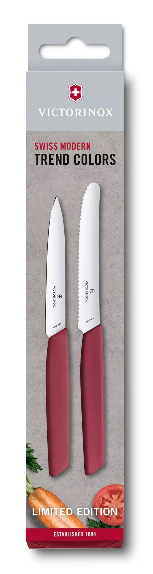 Sada obsahuje nůž na zeleninu s vlnkovaným ostřím o délce 11 centrimetrů a univerzální kuchyňský nůž s rovným ostřím o délce 10 centimetrů.