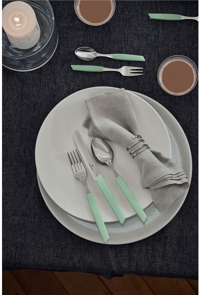 24dílná sada příborů s moderně tvarovanou plastovou rukojetí v zelené barvě obsahuje 6 nožů s vlnkovanou čepelí dlouhou 11 cm, 6 vidliček, 6 lžic a 6 čajových lžiček. Příbory lze mýt v myčce.