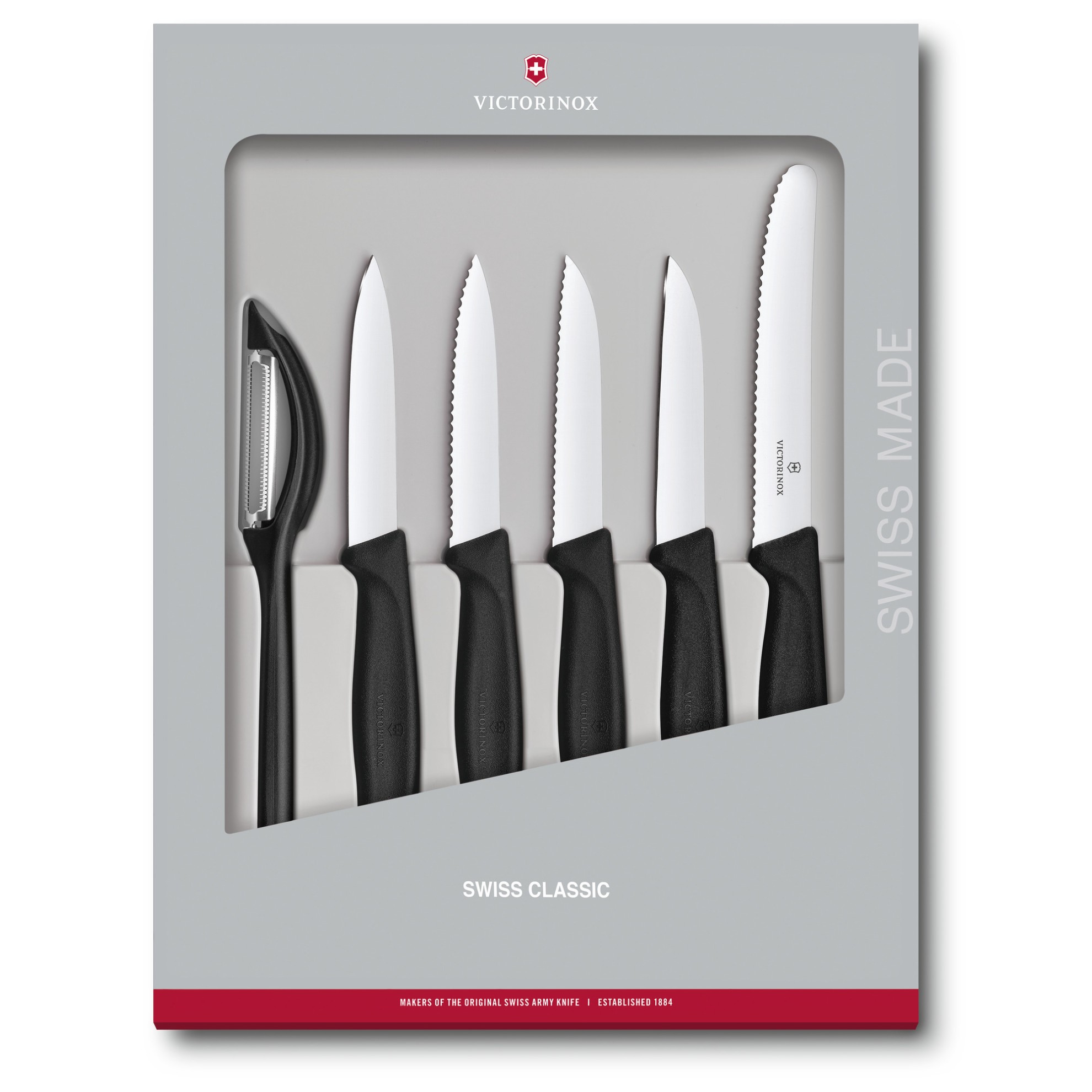 Sada s černými ergonomickými rukojeťmi a ocelovými čepelemi obsahující celkem 6 kusů: