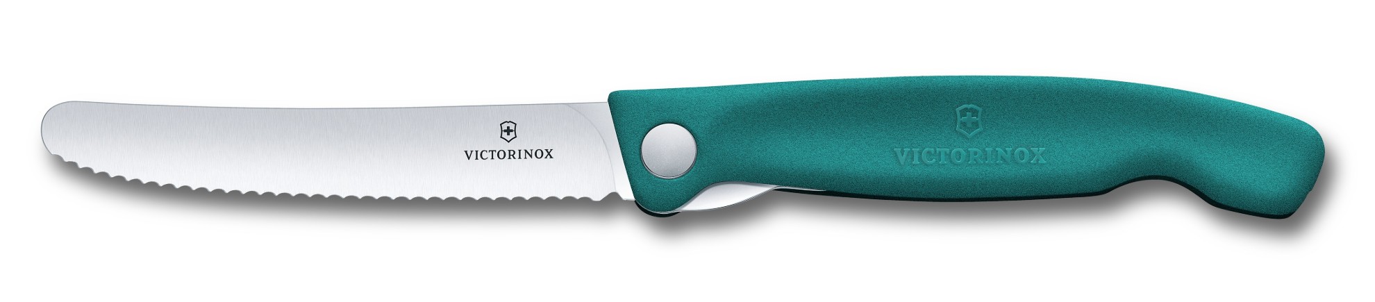 Skládací svačinový nůž s vlnkovanou čepelí dlouhou 11 cm vhodnou zejména pro krájení potravin s tužším povrchem a měkkým středem - rajčata, pečivo atd. Nůž je vybaven pojistkou.