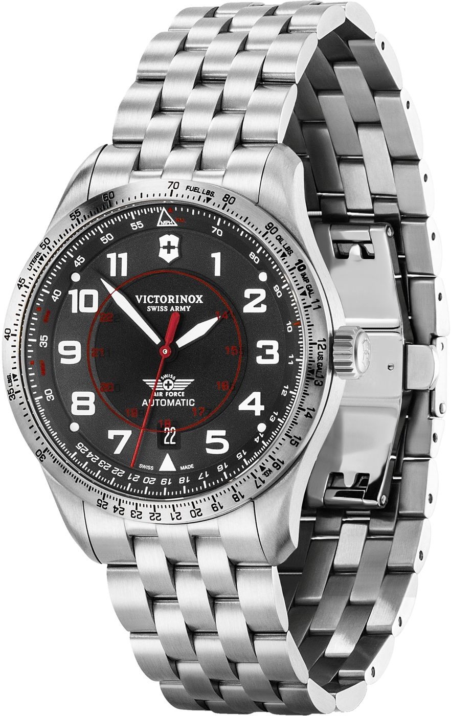 Victorinox AirBoss Mechanical 241888 jsou pánské pilotní automatické hodinky na ocelovém náramku s motýlkovou sponou. Pouzdro z nerezové oceli má průměr 42 milimetrů, průhledné dýnko a otočnou logaritmickou lunetu. Černý číselník s ukazatelem data a 24hodinovým formátem zobrazení času je chráněn odolným safírovým sklem s antireflexní vrstvou. Ručičky a indexy pokrývá luminiscenční nátěr Super-LumiNova®, který po nasvícení garantuje perfektní čitelnost za zhoršených světelných podmínek. Pohon hodinek zajišťuje švýcarský mechanický strojek Sellita SW200-1 s automatickým nátahem a rezervou chodu 38 hodin. S vodotěsností 10 ATM jsou hodinky vhodné pro plavání a šnorchlování.