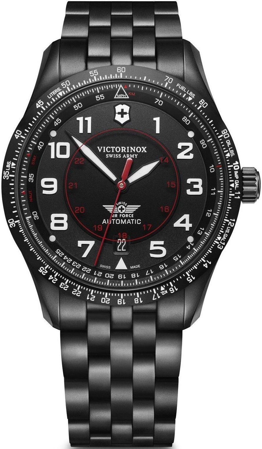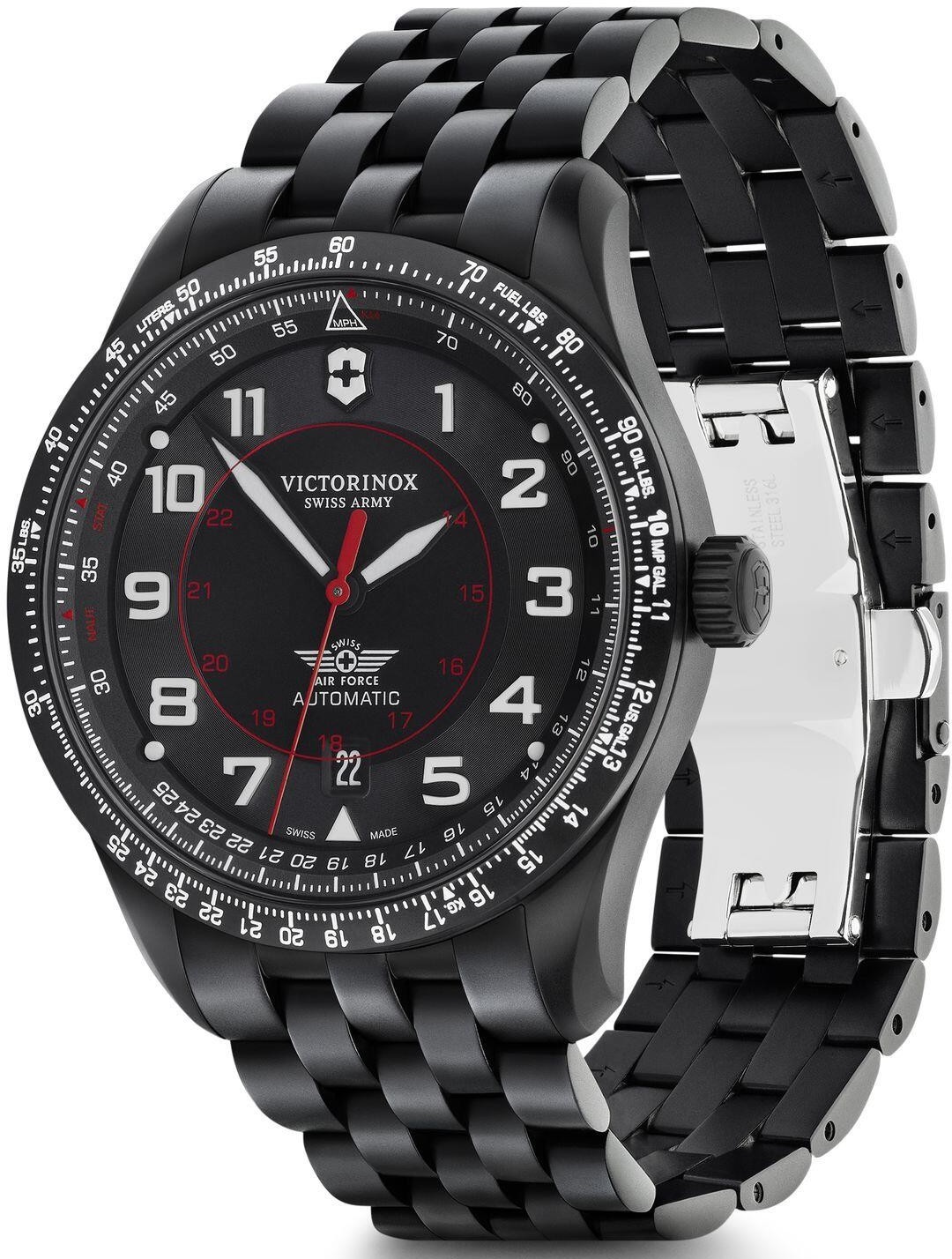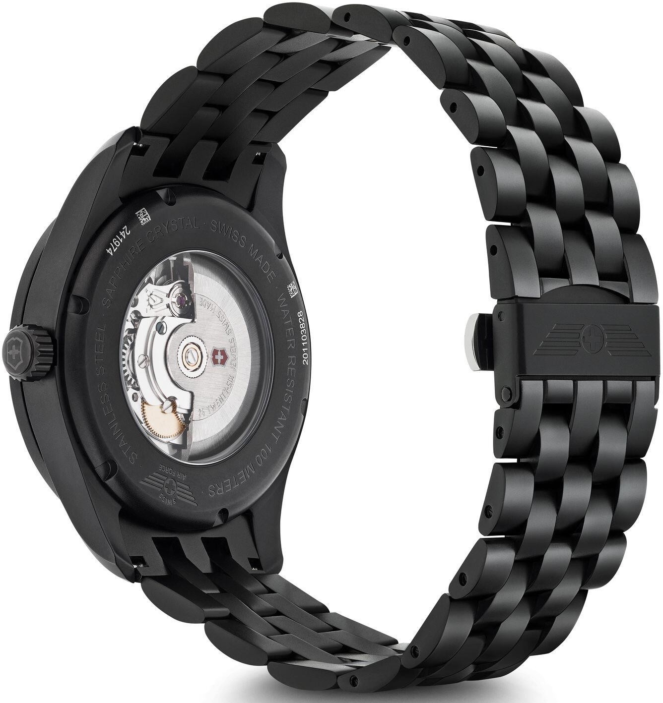Victorinox AirBoss Mechanical 241974 jsou pánské pilotní automatické hodinky na ocelovém náramku s povrchovou PVD úpravou černé barvy a motýlkovou sponou. Pouzdro z nerezové oceli ve stejné barvě má průměr 42 milimetrů, průhledné dýnko a otočnou logaritmickou lunetu. Černý číselník s ukazatelem data a 24hodinovým formátem zobrazení času je chráněn odolným safírovým sklem s antireflexní vrstvou. Ručičky a indexy pokrývá luminiscenční nátěr Super-LumiNova®, který po nasvícení garantuje perfektní čitelnost za zhoršených světelných podmínek. Pohon hodinek zajišťuje švýcarský mechanický strojek Sellita SW200-1 s automatickým nátahem a rezervou chodu 38 hodin. S vodotěsností 10 ATM jsou hodinky vhodné pro plavání a šnorchlování.