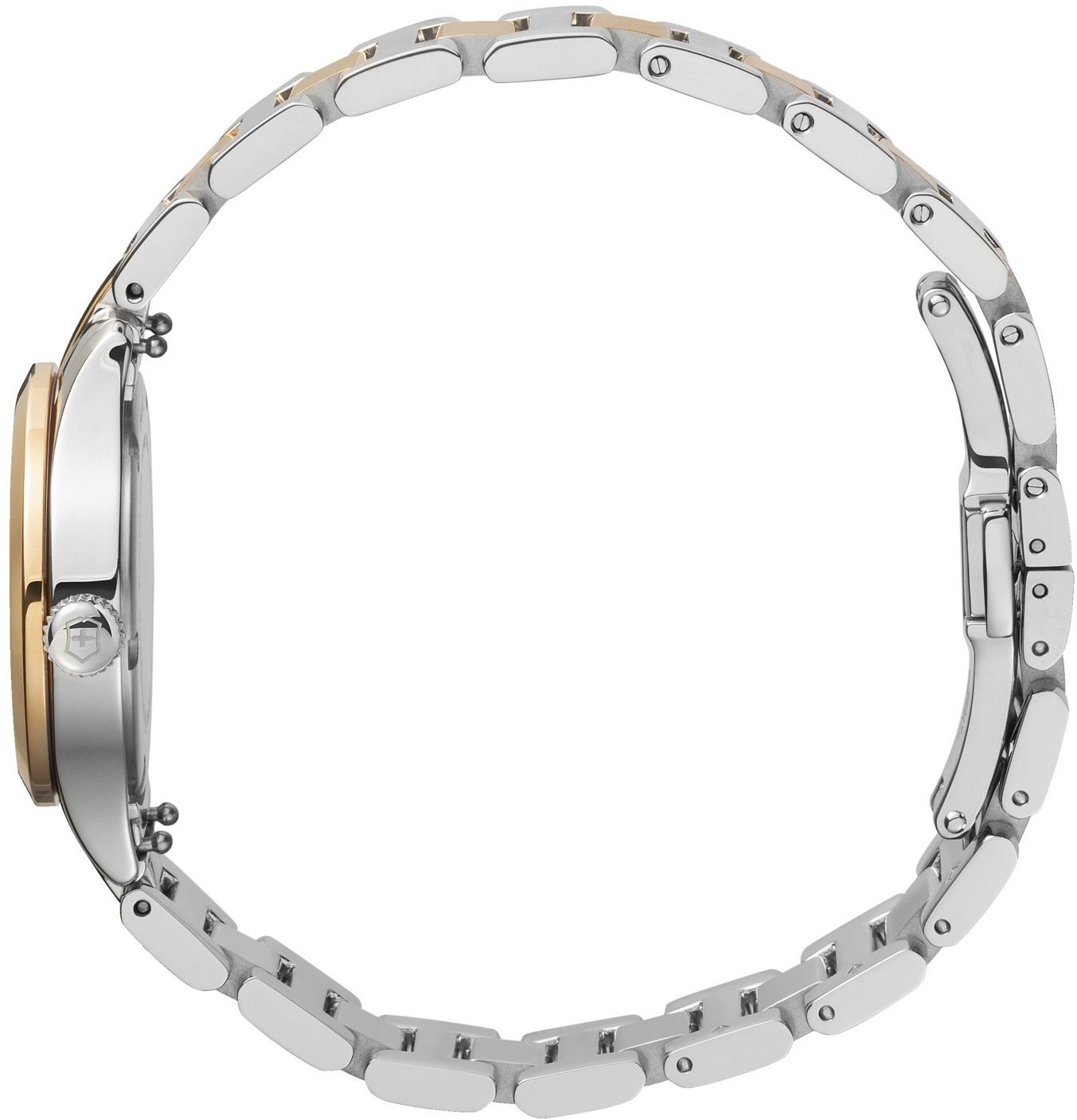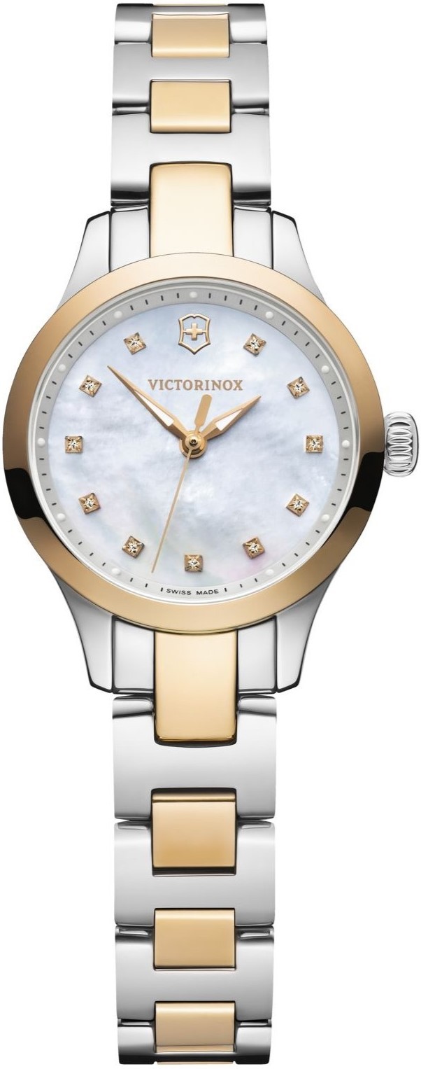 Victorinox Alliance XS 241877 jsou dámské klasické bateriové hodinky na ocelovém bicolor náramku s motýlkovou sponou. Některé články náramku a luneta disponují povrchovou PVD úpravou zlaté barvy. Pouzdro z nerezové oceli má průměr 28 milimetrů. Perleťový číselník s 11 krystaly Swarovski je chráněn odolným safírovým sklem s antireflexní vrstvou a jeho krásu můžeme obdivovat zejména na přímém světle, kdy můžeme pozorovat hru barev perleti. Ručičky a body u indexů pokrývá luminiscenční nátěr SuperLuminova, který po nasvícení garantuje perfektní čitelnost za zhoršených světelných podmínek. Pohon hodinek zajišťuje švýcarský quartzový strojek. S vodotěsností 10 ATM jsou hodinky vhodné pro plavání a šnorchlování.