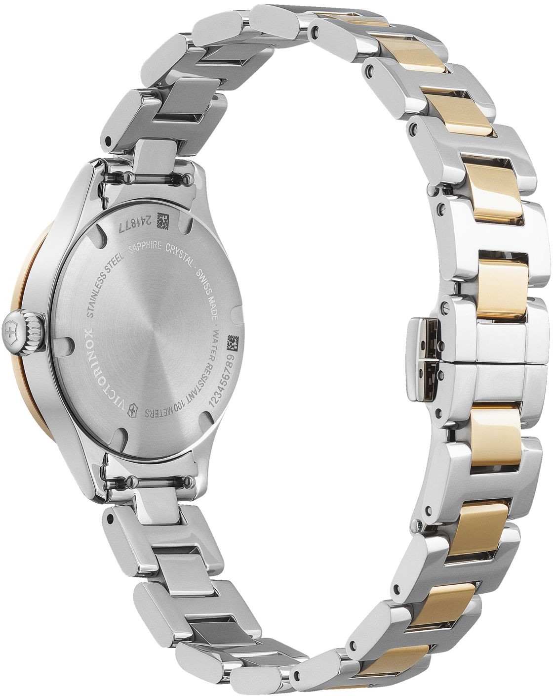 Victorinox Alliance XS 241877 jsou dámské klasické bateriové hodinky na ocelovém bicolor náramku s motýlkovou sponou. Některé články náramku a luneta disponují povrchovou PVD úpravou zlaté barvy. Pouzdro z nerezové oceli má průměr 28 milimetrů. Perleťový číselník s 11 krystaly Swarovski je chráněn odolným safírovým sklem s antireflexní vrstvou a jeho krásu můžeme obdivovat zejména na přímém světle, kdy můžeme pozorovat hru barev perleti. Ručičky a body u indexů pokrývá luminiscenční nátěr SuperLuminova, který po nasvícení garantuje perfektní čitelnost za zhoršených světelných podmínek. Pohon hodinek zajišťuje švýcarský quartzový strojek. S vodotěsností 10 ATM jsou hodinky vhodné pro plavání a šnorchlování.