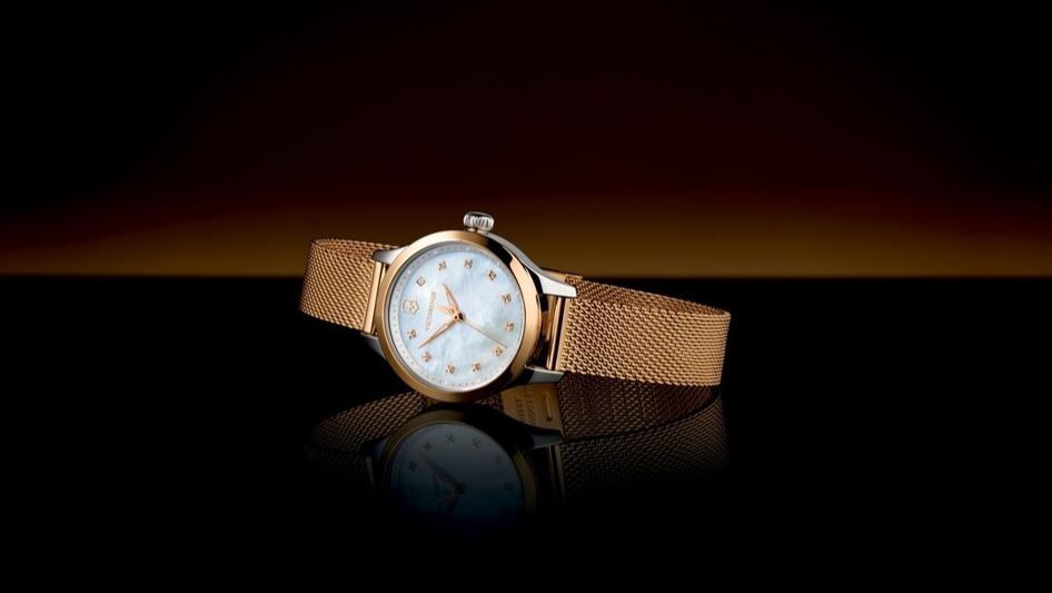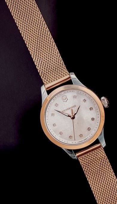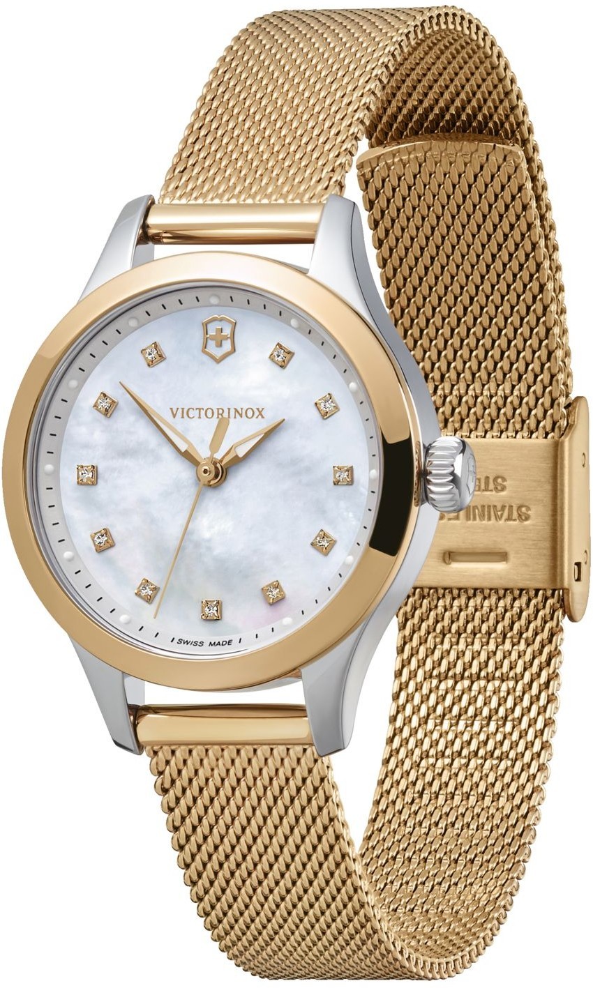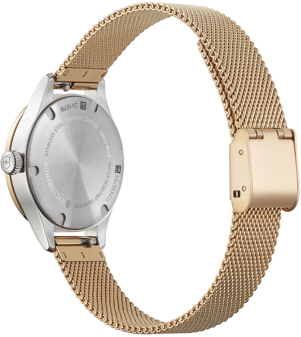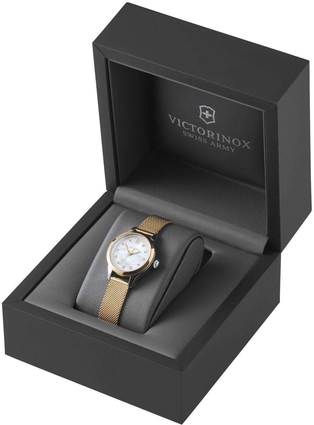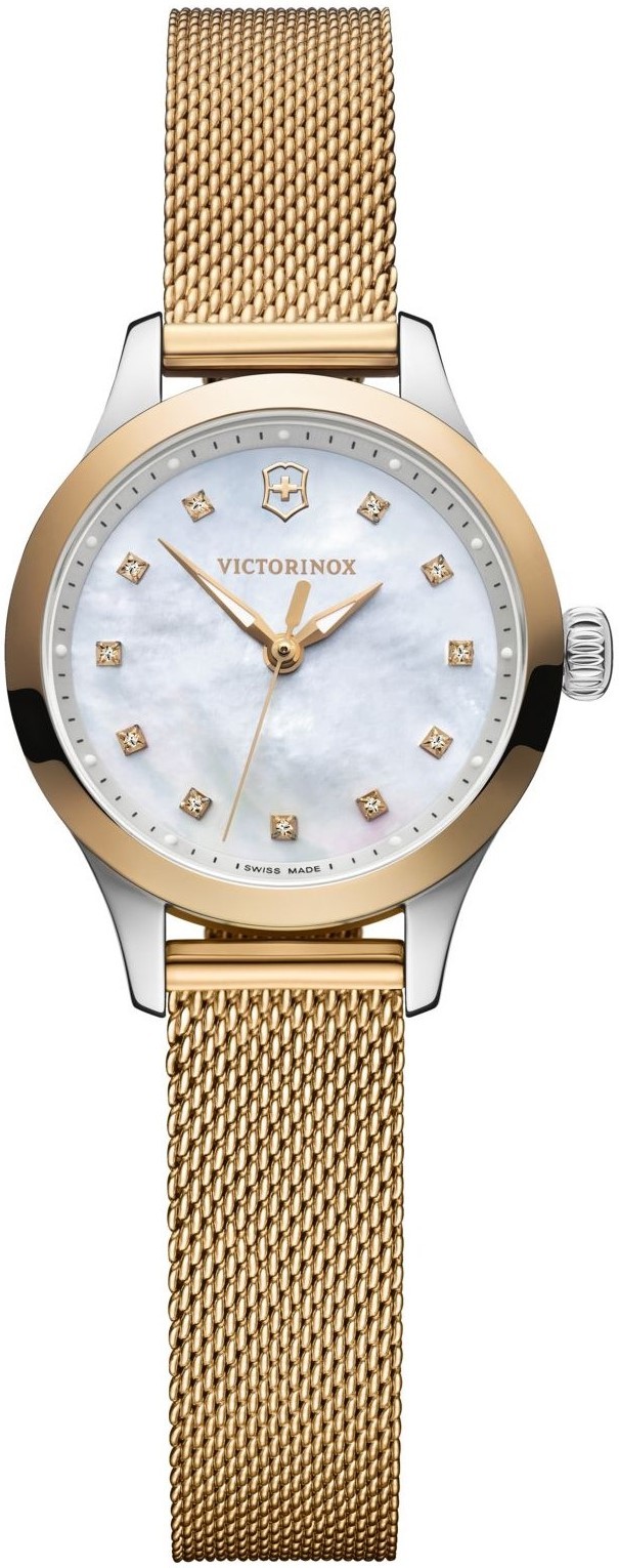 Victorinox Alliance XS 241879 jsou dámské elegantní bateriové hodinky na ocelovém milánském tahu s povrchovou PVD úpravou zlaté barvy a motýlkovou sponou. Pouzdro z nerezové oceli ve stejné barvě má průměr 28 milimetrů. Perleťový číselník s 11 krystaly Swarovski je chráněn odolným safírovým sklem s antireflexní vrstvou a jeho krásu můžeme obdivovat zejména na přímém světle, kdy můžeme pozorovat hru barev perleti. Ručičky a body u indexů pokrývá luminiscenční nátěr SuperLuminova, který po nasvícení garantuje perfektní čitelnost za zhoršených světelných podmínek. Pohon hodinek zajišťuje švýcarský quartzový strojek. S vodotěsností 10 ATM jsou hodinky vhodné pro plavání a šnorchlování.
