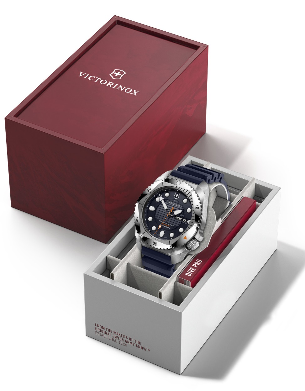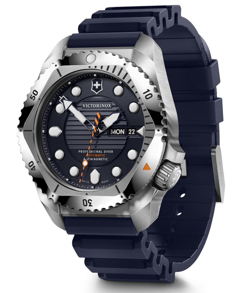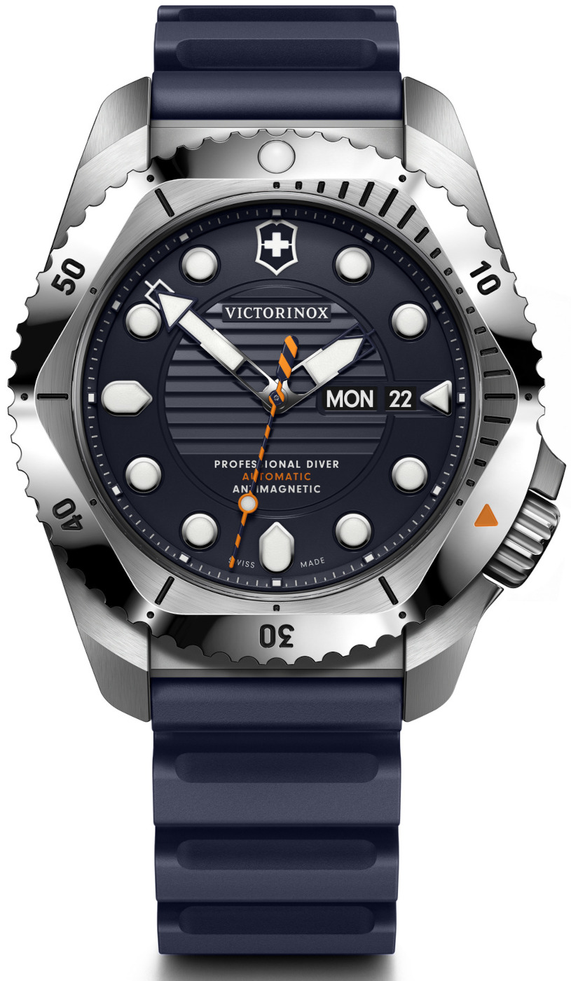 Victorinox Dive Pro Automatic 241995 jsou pánské sportovní automatické hodinky na tmavě modrém kaučukovém řemínku s trnovou sponou. Ocelové pouzdro má průměr 43 milimetrů, jednosměrně otočnou lunetu s minutovou stupnicí a šroubovací korunku. Tmavě modrý číselník s texturovaným středem a ukazatelem data a dne v týdnu na třetí hodině je chráněn odolným safírovým sklem s antireflexní vrstvou. Ručičky, indexy a bod na lunetě pokrývá luminiscenční nátěr SuperLuminova, který po nasvícení garantuje perfektní čitelnost za zhoršených světelných podmínek. Pohon hodinek zajišťuje mechanický strojek Sellita SW220 s automatickým nátahem a rezervou chodu 38 hodin. S vodotěsností 30 ATM jsou hodinky vhodné pro hlubinné potápění.