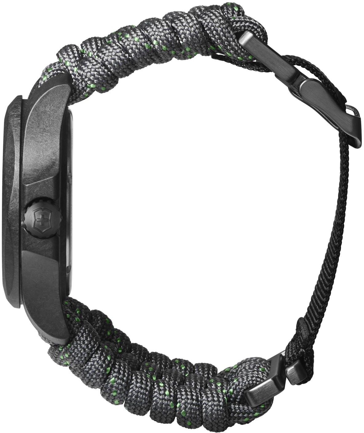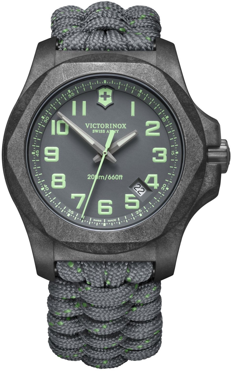 Victorinox I.N.O.X. 241861 jsou pánské sportovní bateriové hodinky na šedo-zeleném textilním řemínku s trnovou sponou. Karbonové pouzdro má průměr 43 milimetrů a šroubovací korunku. Šedý číselník s ukazatelem data je chráněn odolným safírovým sklem s antireflexní vrstvou. Ručičky a indexy pokrývá luminiscenční nátěr Super-LumiNova®, který po nasvícení garantuje perfektní čitelnost za zhoršených světelných podmínek. Pohon hodinek zajišťuje švýcarský quartzový strojek Ronda 715. S vodotěsností 20 ATM jsou hodinky vhodné pro hlubinné potápění. Součástí balení je navíc kaučukový řemínek v černé barvě a gumový kryt lunety znázorňující světové strany.