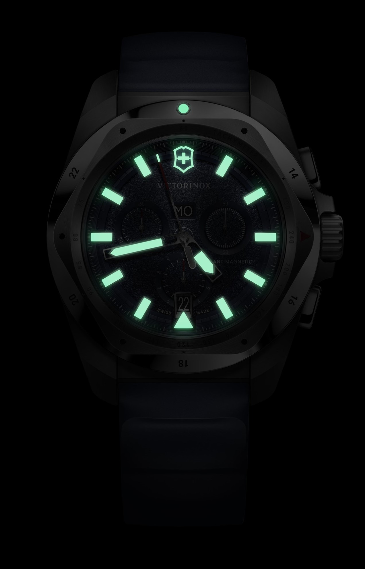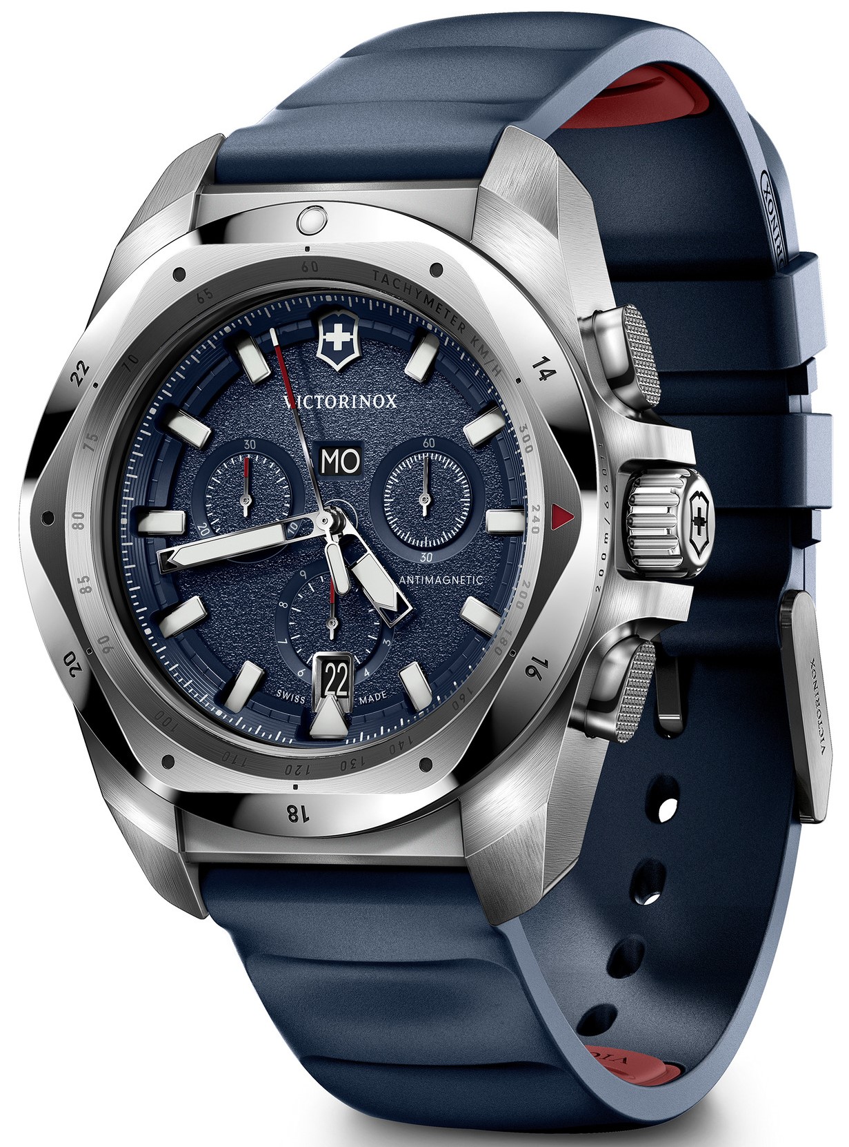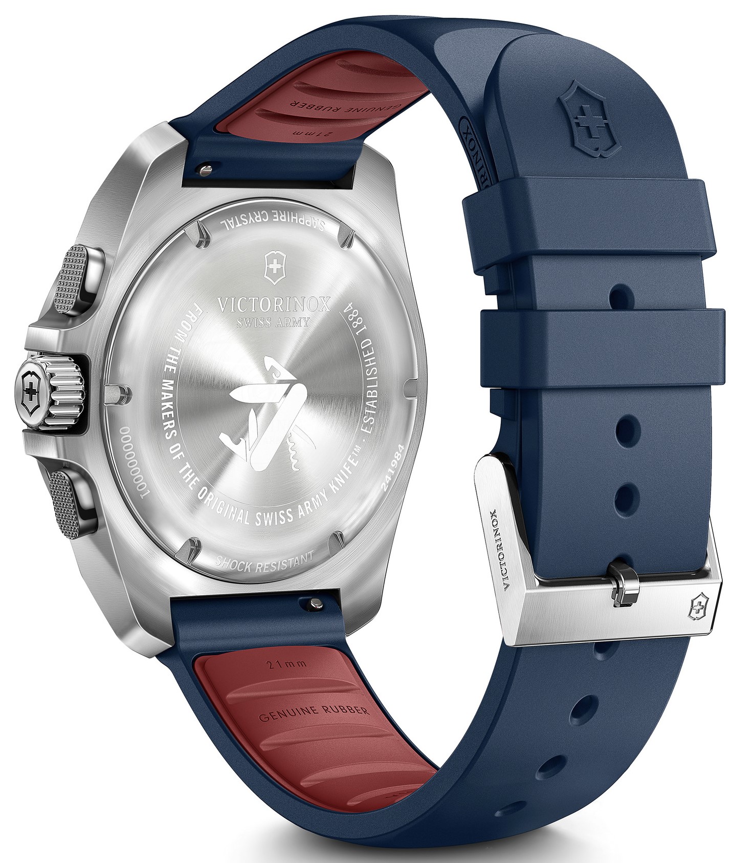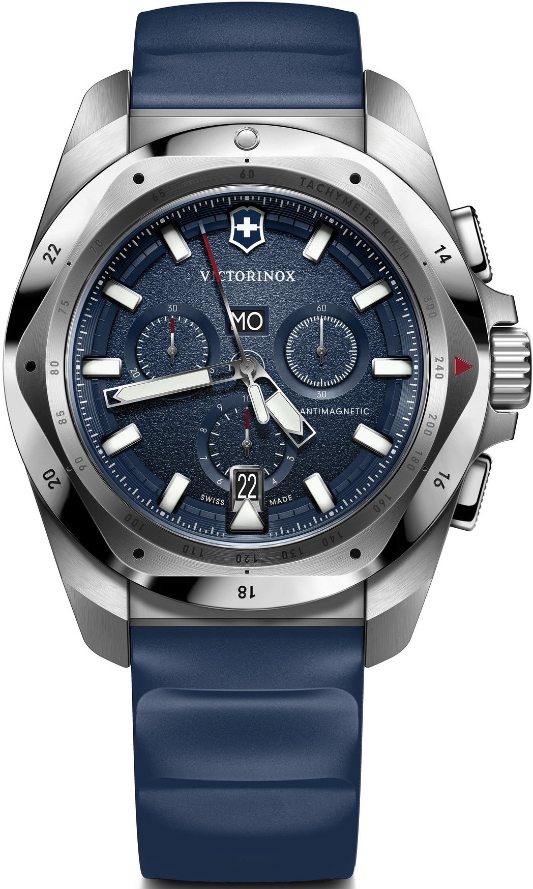 Victorinox I.N.O.X. 241984 jsou pánské sportovní bateriové hodinky na modrém kaučukovém řemínku s trnovou sponou. Pouzdro z nerezové oceli má průměr 43 milimetrů, lunetu s tachymetrickou stupnicí a šroubovací korunku. Modrý texturovaný číselník se stopkami a indikací data a dne v týdnu je chráněn odolným safírovým sklem s antireflexní vrstvou. Ručičky, indexy a bod na lunetě mají luminiscenční nátěr Super-LumiNova®, který po nasvícení garantuje perfektní čitelnost za zhoršených světelných podmínek. Pohon hodinek zajišťuje švýcarský quartzový strojek Ronda 5040.E. S vodotěsností 20 ATM jsou hodinky vhodné pro hlubinné potápění.