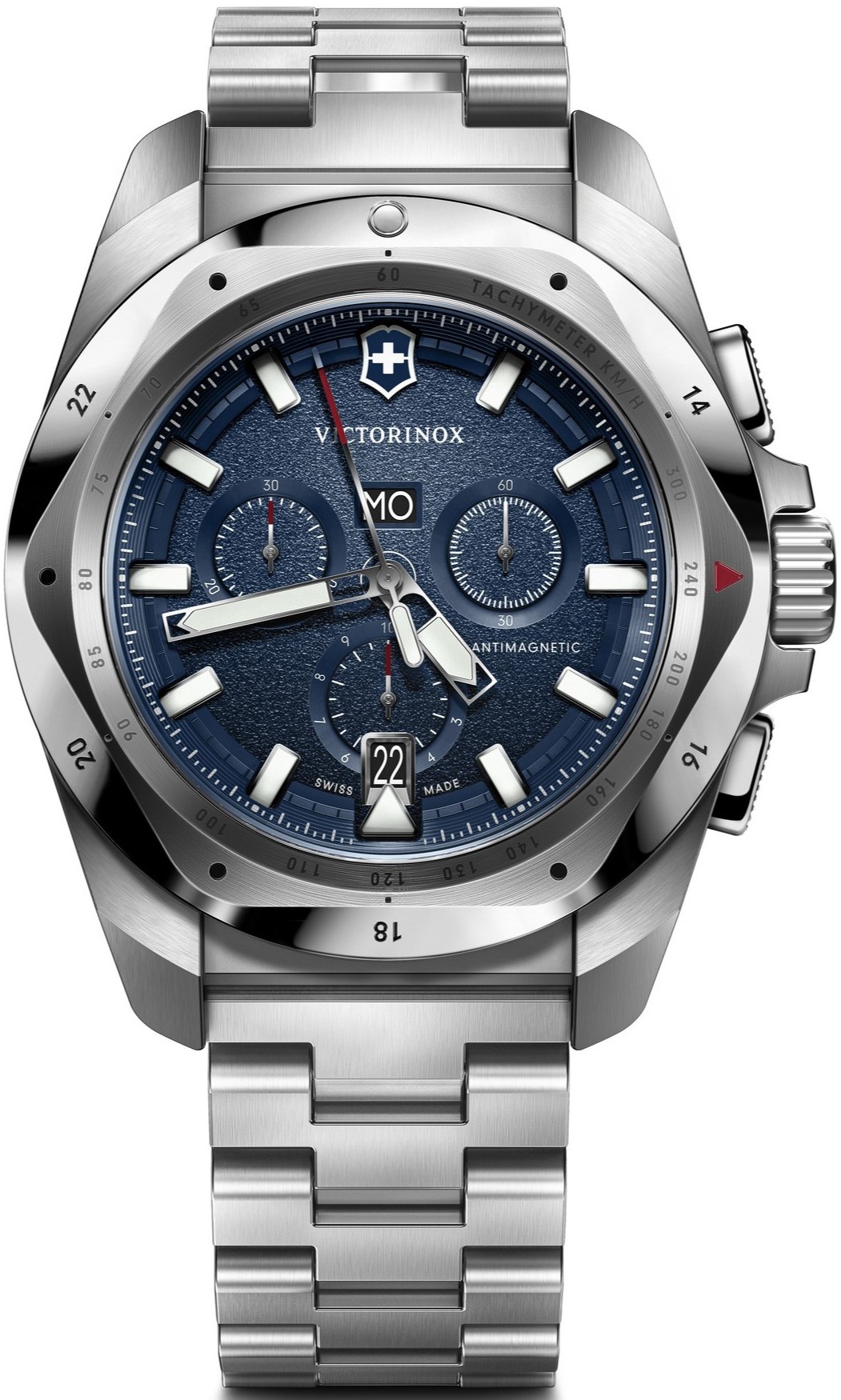 Victorinox I.N.O.X. 241985 jsou pánské sportovní bateriové hodinky na ocelovém náramku s motýlkovou sponou. Pouzdro z nerezové oceli má průměr 43 milimetrů, lunetu s tachymetrickou stupnicí a šroubovací korunku. Modrý texturovaný číselník se stopkami a indikací data a dne v týdnu je chráněn odolným safírovým sklem s antireflexní vrstvou. Ručičky, indexy a bod na lunetě mají luminiscenční nátěr Super-LumiNova®, který po nasvícení garantuje perfektní čitelnost za zhoršených světelných podmínek. Pohon hodinek zajišťuje švýcarský quartzový strojek Ronda 5040.E. S vodotěsností 20 ATM jsou hodinky vhodné pro hlubinné potápění.