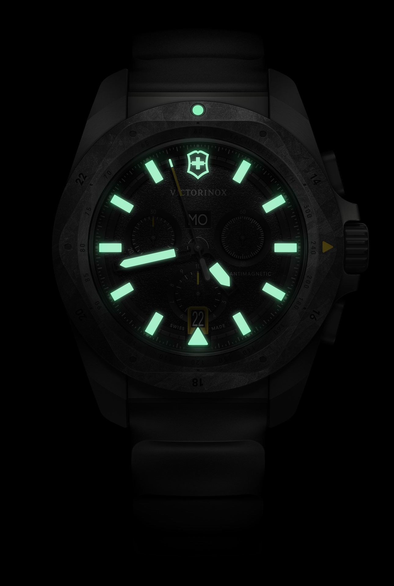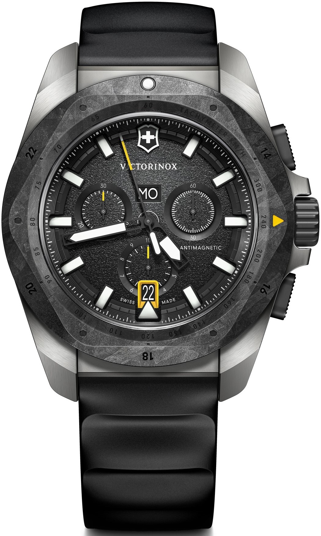 Victorinox I.N.O.X. 242011 jsou pánské sportovní bateriové hodinky na černém kaučukovém řemínku s trnovou sponou. Titanové pouzdro má průměr 43 milimetrů, karbonovou lunetu s tachymetrickou stupnicí a šroubovací korunku. Černý texturovaný číselník se stopkami a indikací data a dne v týdnu je chráněn odolným safírovým sklem s antireflexní vrstvou. Ručičky, indexy a bod na lunetě mají luminiscenční nátěr Super-LumiNova®, který po nasvícení garantuje perfektní čitelnost za zhoršených světelných podmínek. Pohon hodinek zajišťuje švýcarský quartzový strojek Ronda 5040.E. S vodotěsností 20 ATM jsou hodinky vhodné pro hlubinné potápění.
