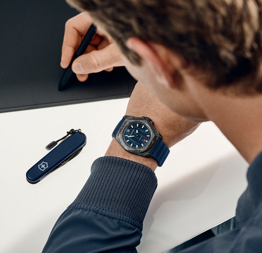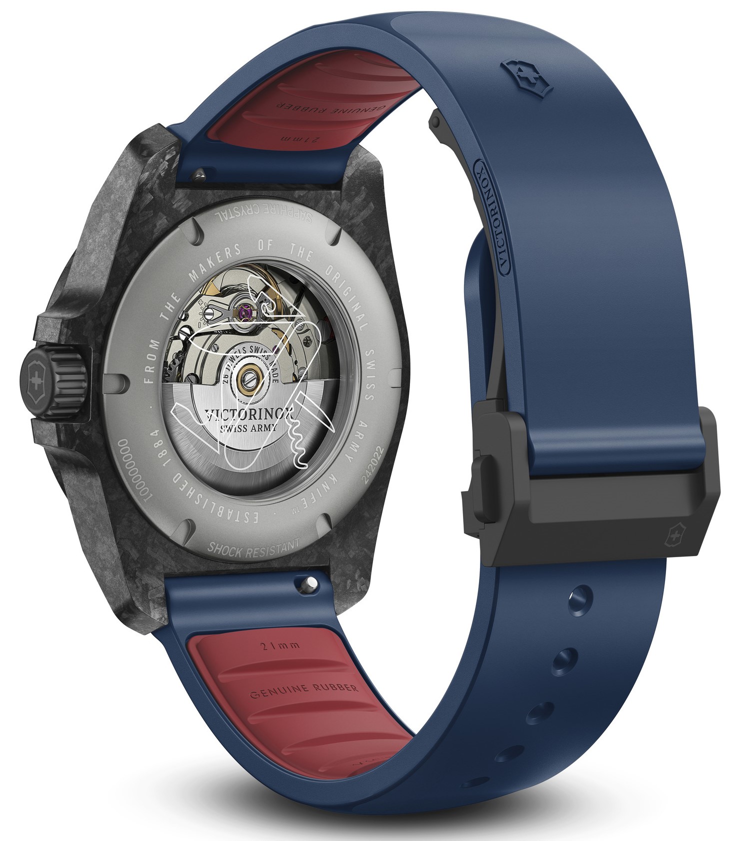 Victorinox I.N.O.X. 242022.1 jsou pánské sportovní automatické hodinky na tmavě modrém kaučukovém řemínku s překlápěcí sponou. Karbonové pouzdro má průměr 41 milimetrů, průhledné dýnko a šroubovací korunku. Modrý texturovaný číselník s ukazatelem data na šesté hodině je chráněn odolným safírovým sklem s antireflexní vrstvou. Ručičky a indexy pokrývá luminiscenční nátěr Super-LumiNova®, který po nasvícení garantuje perfektní čitelnost za zhoršených světelných podmínek. Pohon hodinek zajišťuje mechanický strojek Sellita SW200-1 s automatickým nátahem a rezervou chodu 38 hodin. S vodotěsností 20 ATM jsou hodinky vhodné pro hlubinné potápění. Součástí balení je kapesní nůž Victorinox Spartan.
