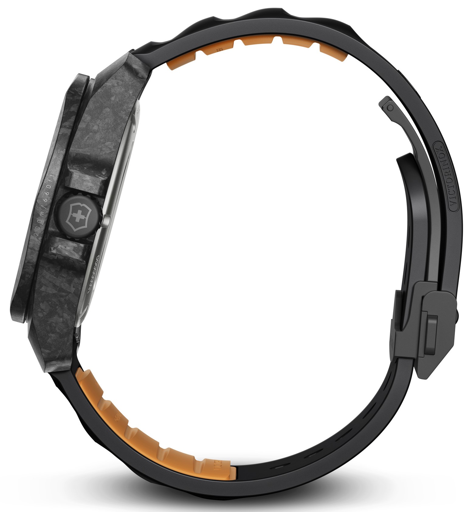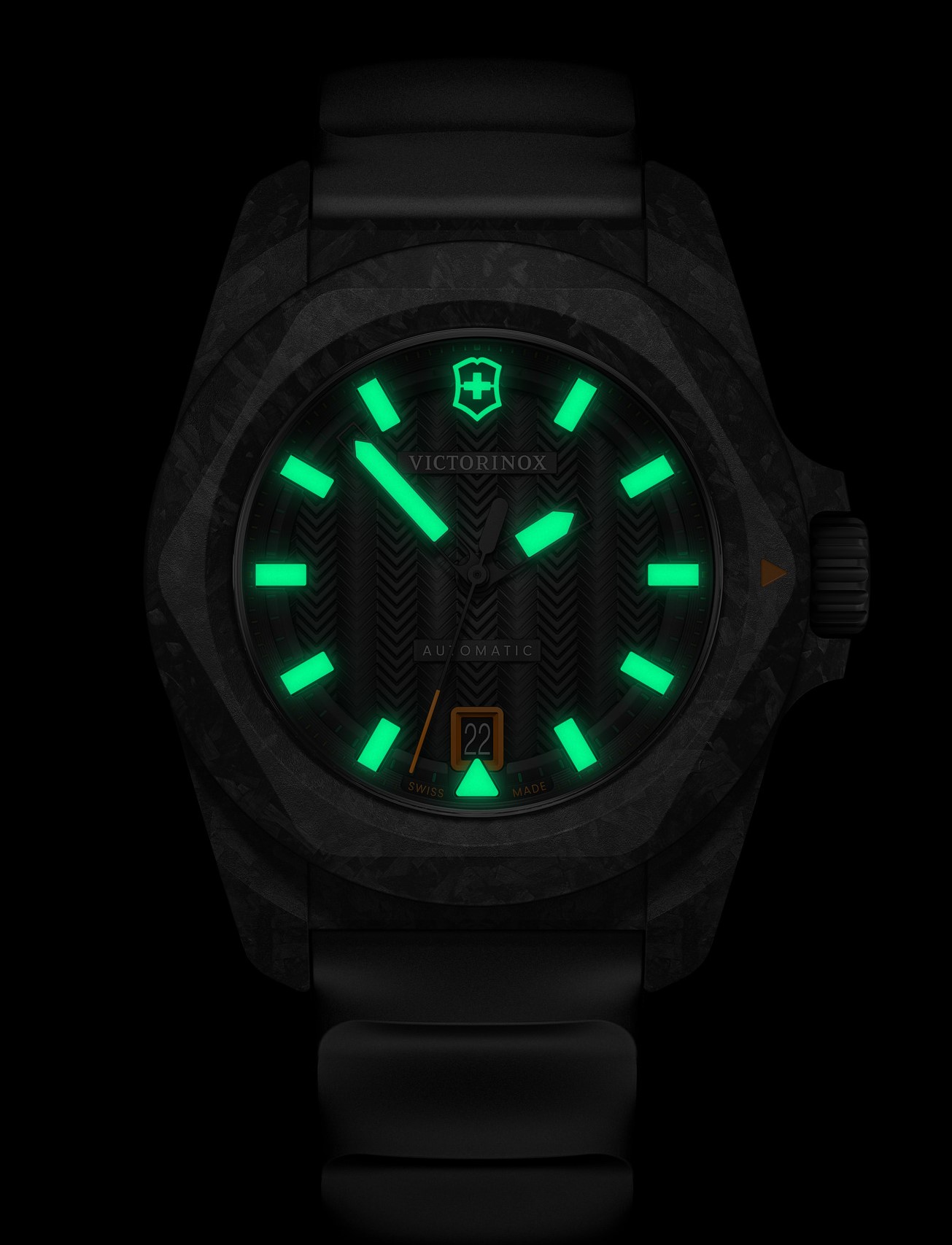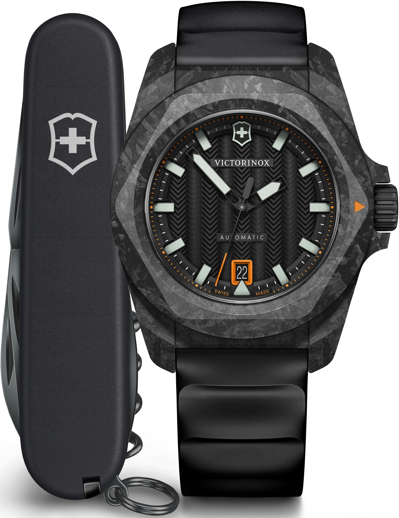 Victorinox I.N.O.X. 242023.1 jsou pánské sportovní automatické hodinky na černém kaučukovém řemínku s překlápěcí sponou. Karbonové pouzdro má průměr 41 milimetrů, průhledné dýnko a šroubovací korunku. Černý texturovaný číselník s ukazatelem data na šesté hodině je chráněn odolným safírovým sklem s antireflexní vrstvou. Ručičky a indexy pokrývá luminiscenční nátěr Super-LumiNova®, který po nasvícení garantuje perfektní čitelnost za zhoršených světelných podmínek. Pohon hodinek zajišťuje mechanický strojek Sellita SW200-1 s automatickým nátahem a rezervou chodu 38 hodin. S vodotěsností 20 ATM jsou hodinky vhodné pro hlubinné potápění. Součástí balení je kapesní nůž Victorinox Spartan.