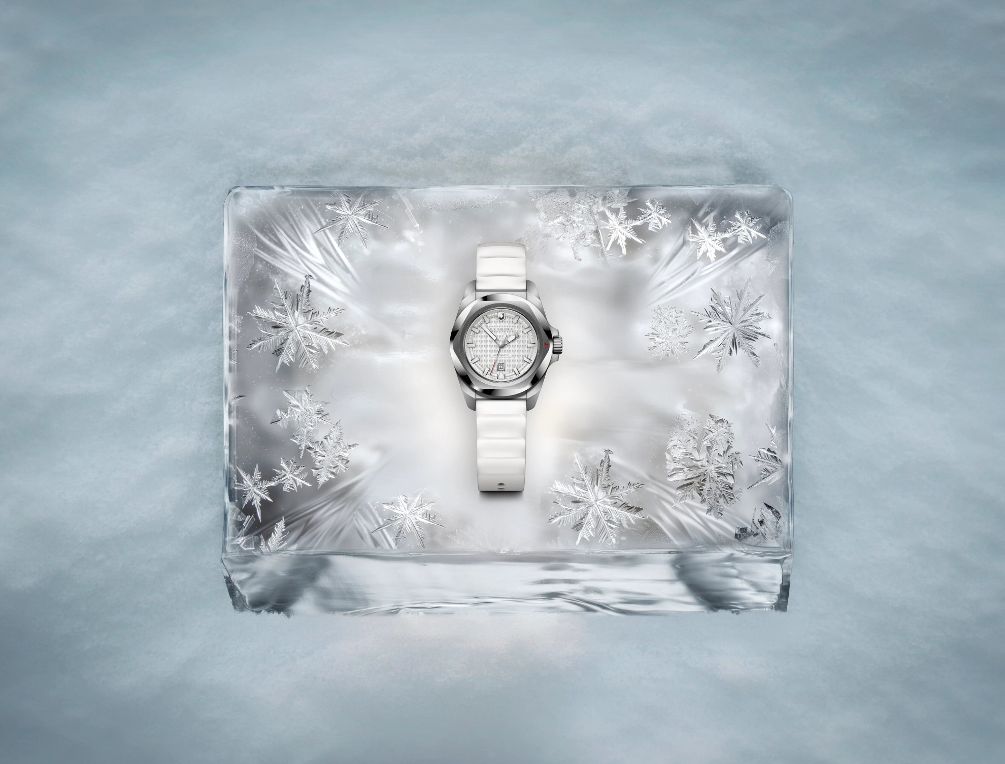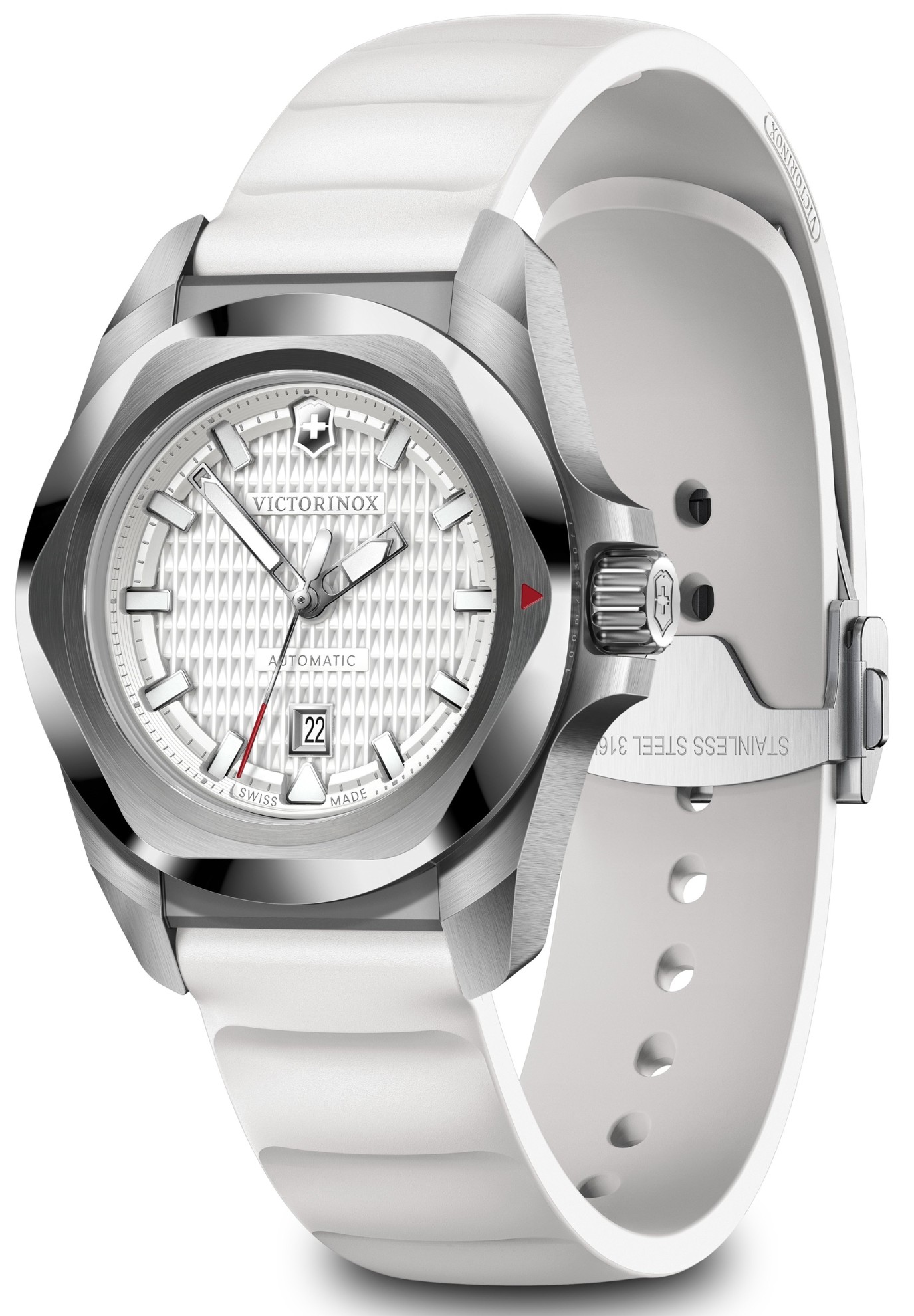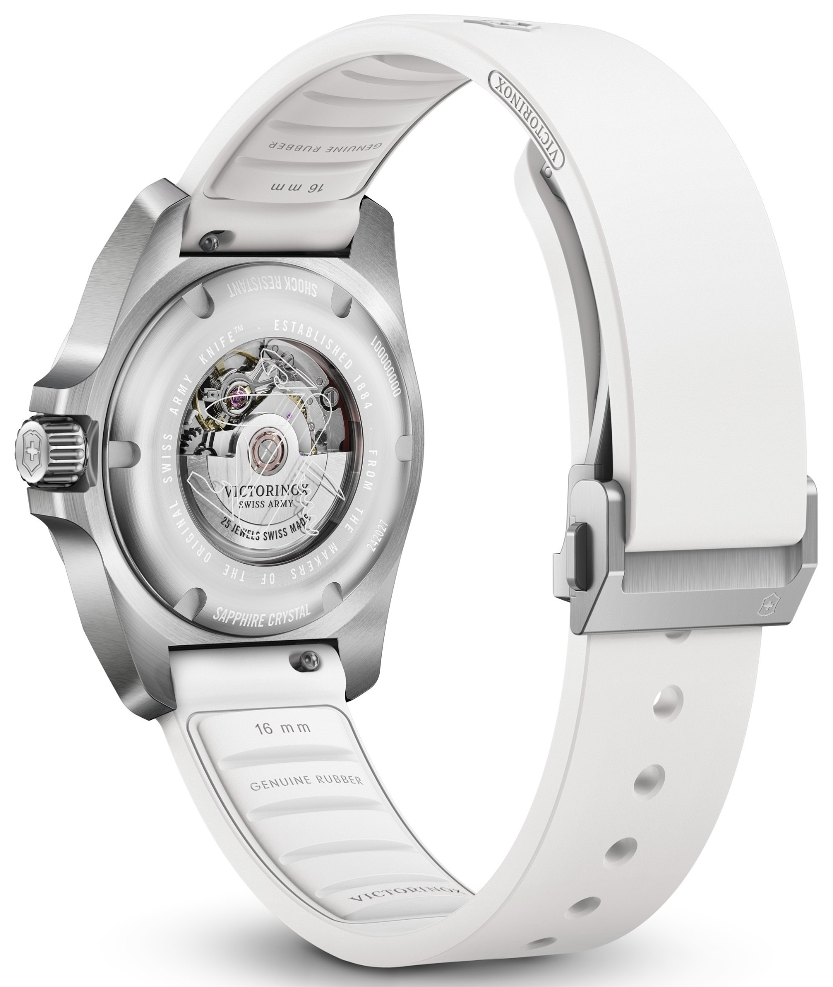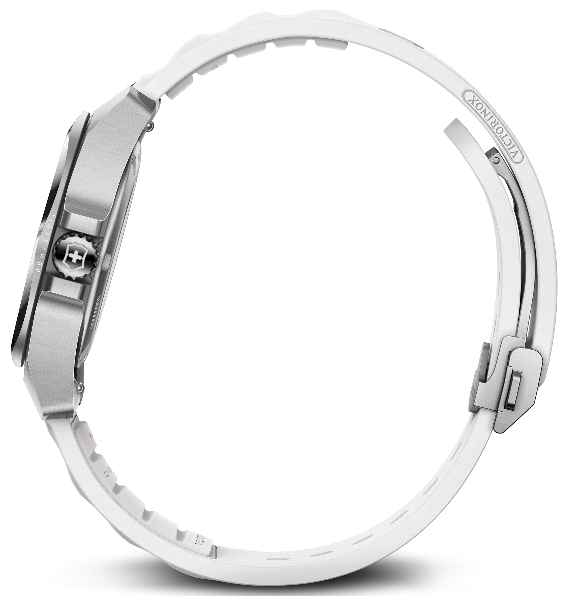 Victorinox I.N.O.X. 242027 jsou dámské sportovní automatické hodinky na bílém kaučukovém řemínku s překlápěcí sponou. Pouzdro z nerezové oceli má průměr 32 milimetrů a průhledné dýnko. Bílý texturovaný číselník s ukazatelem data na šesté hodině je chráněn odolným safírovým sklem s antireflexní vrstvou. Ručičky a indexy pokrývá luminiscenční nátěr Super-LumiNova®, který po nasvícení garantuje perfektní čitelnost za zhoršených světelných podmínek. Pohon hodinek zajišťuje mechanický strojek Sellita SW100 s automatickým nátahem a rezervou chodu 42 hodin. S vodotěsností 10 ATM jsou hodinky vhodné pro plavání a šnorchlování.