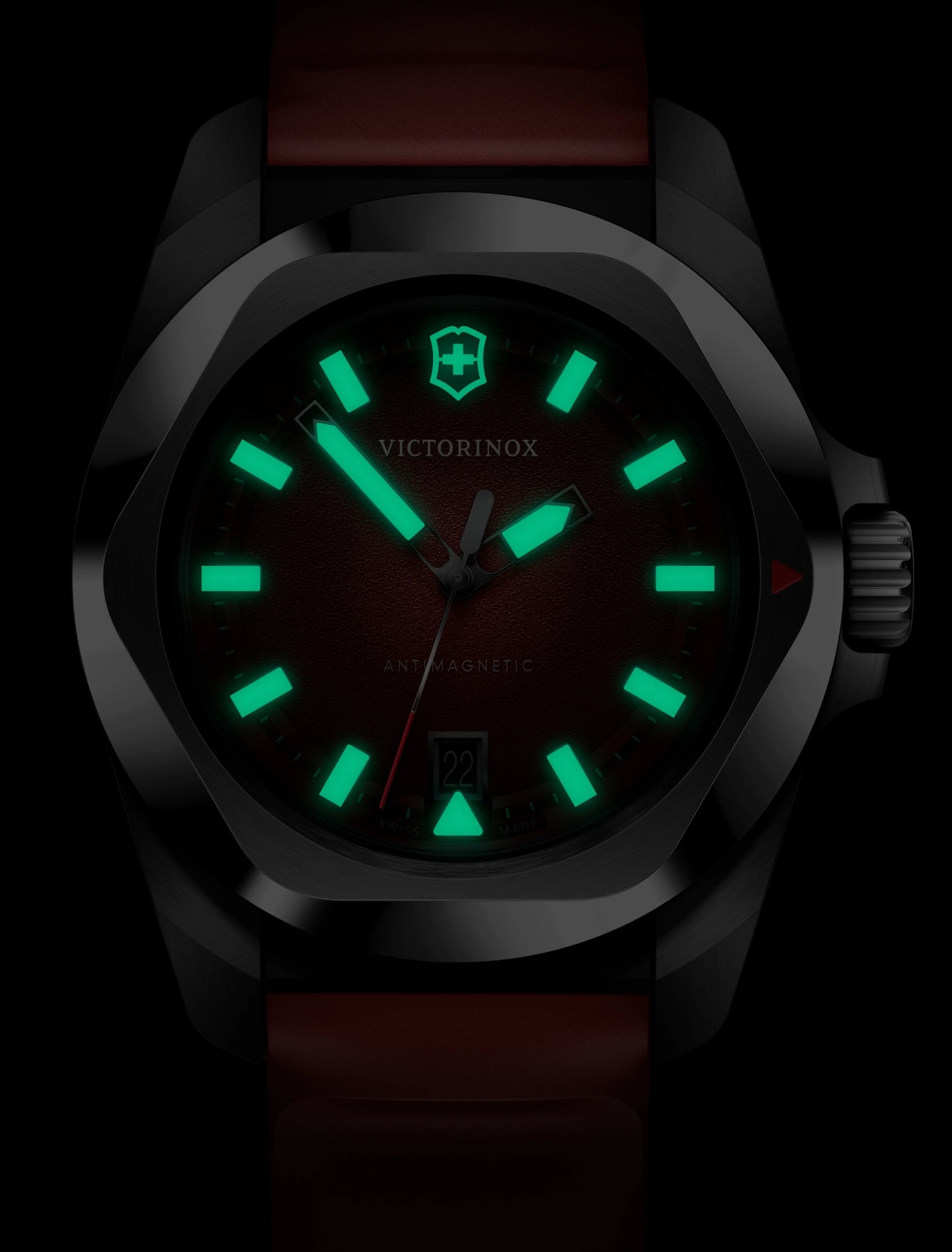 Victorinox I.N.O.X. 242029 jsou pánské sportovní bateriové hodinky na červeném kaučukovém řemínku s trnovou sponou. Pouzdro z nerezové oceli má průměr 41 milimetrů a šroubovací korunku. Červený číselník s ukazatelem data na šesté hodině je chráněn odolným safírovým sklem s antireflexní vrstvou. Ručičky a indexy pokrývá luminiscenční nátěr Super-LumiNova®, který po nasvícení garantuje perfektní čitelnost za zhoršených světelných podmínek. Pohon hodinek zajišťuje švýcarský quartzový strojek Ronda 715. S vodotěsností 20 ATM jsou hodinky vhodné pro hlubinné potápění.