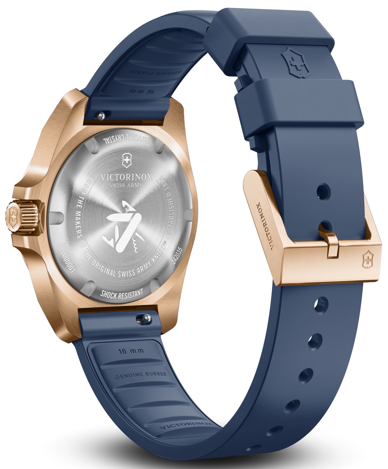 Victorinox I.N.O.X. 242035 jsou dámské sportovní bateriové hodinky na modrém kaučukovém řemínku s trnovou sponou. Pouzdro z nerezové oceli s povrchovou PVD úpravou v barvě růžového zlata má průměr 32 milimetrů. Modrý číselník s ukazatelem data na šesté hodině je chráněn odolným safírovým sklem s antireflexní vrstvou. Ručičky a indexy pokrývá luminiscenční nátěr Super-LumiNova®, který po nasvícení garantuje perfektní čitelnost za zhoršených světelných podmínek. Pohon hodinek zajišťuje švýcarský quartzový strojek Ronda 775. S vodotěsností 10 ATM jsou hodinky vhodné pro plavání a šnorchlování.