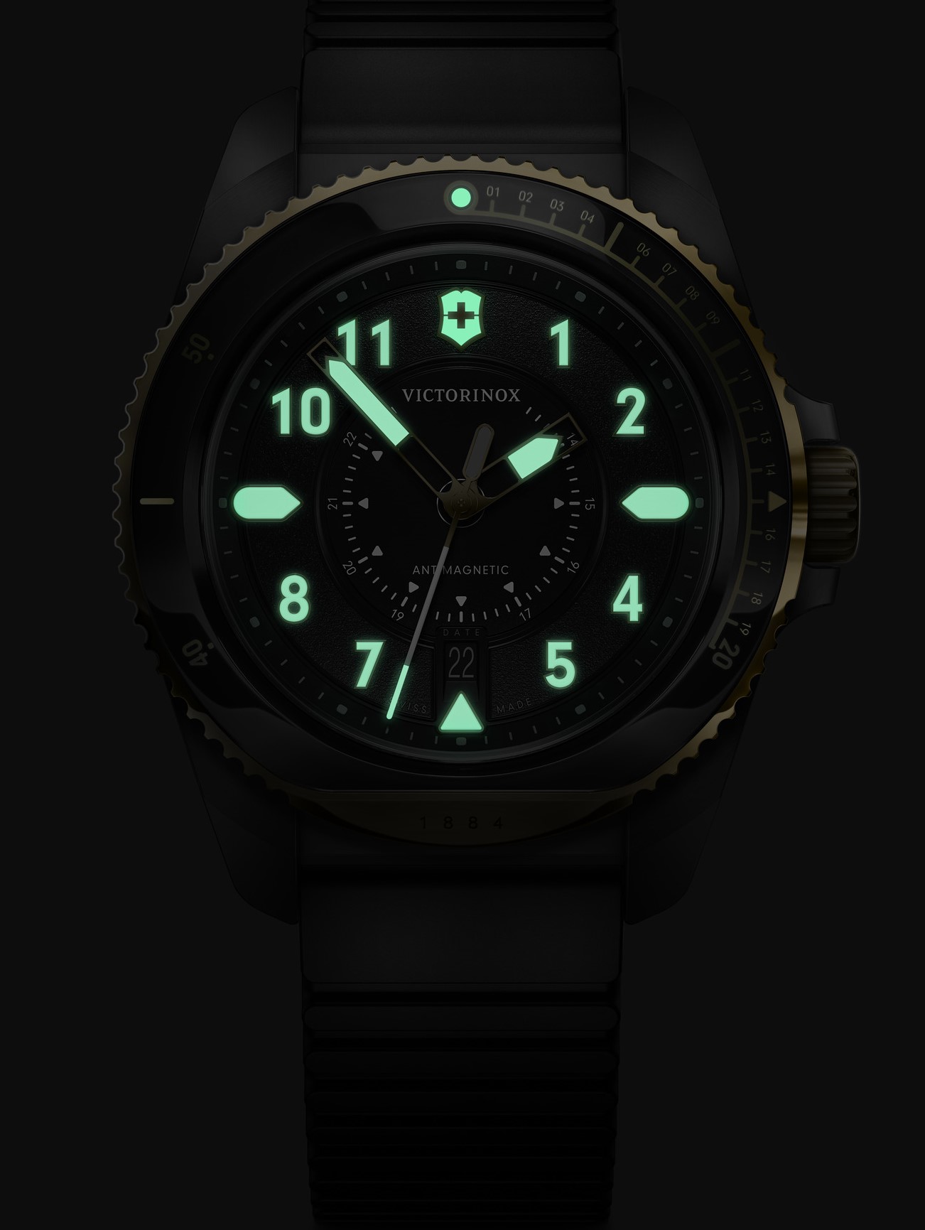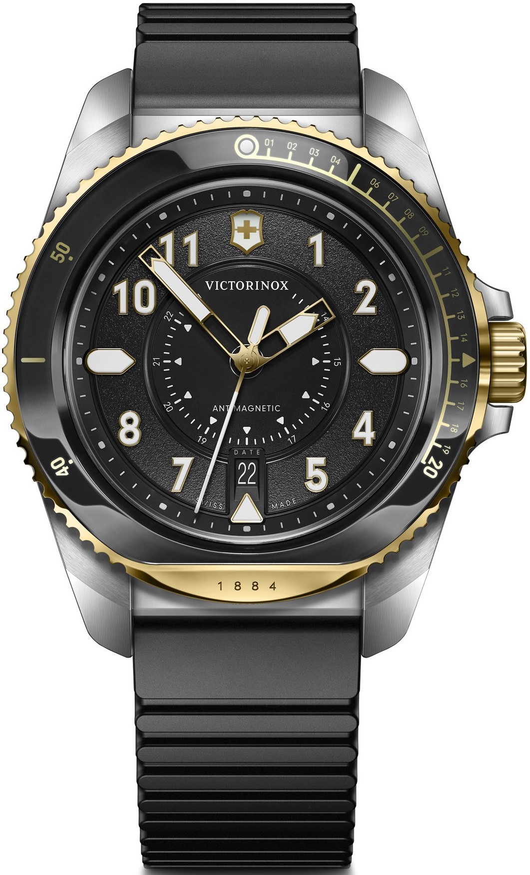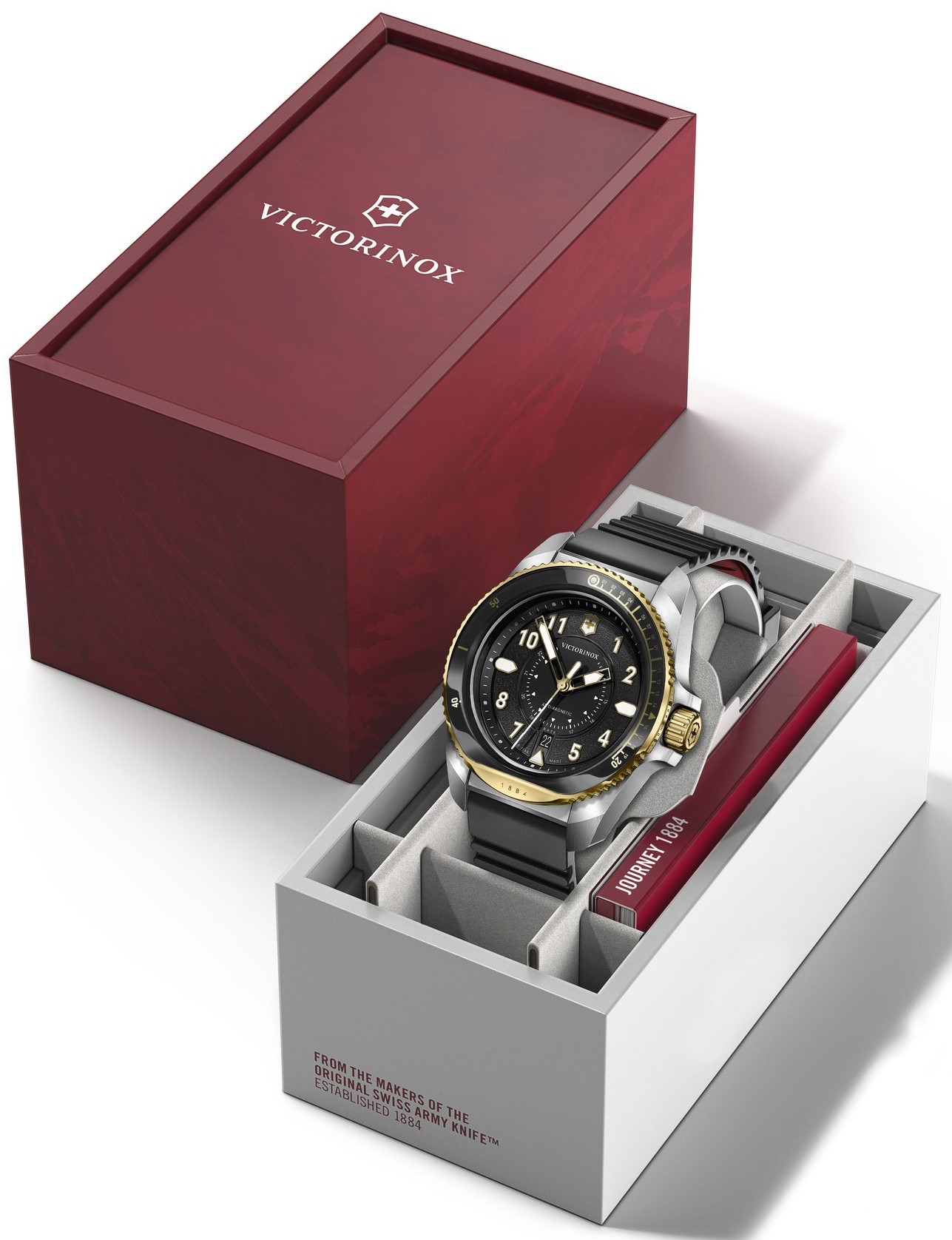 Victorinox Journey 1884 Quartz 242014 jsou pánské sportovní bateriové hodinky na černém kaučukovém řemínku s trnovou sponou. Pouzdro z nerezové oceli má průměr 43 milimetrů, jednosměrně otočnou lunetu s černou keramickou vložkou a šroubovací korunku. Korunka a luneta disponují povrchovou PVD úpravou zlaté barvy. Černý číselník s 24hodinovým formátem zobrazení času a ukazatelem data je chráněn odolným safírovým sklem s antireflexní vrstvou. Ručičky, indexy a bod na lunetě pokrývá luminiscenční nátěr SuperLuminova®, který po nasvícení garantuje perfektní čitelnost za zhoršených světelných podmínek. Pohon hodinek zajišťuje švýcarský quartzový strojek Ronda 715 s funkcí indikace slabé baterie. S vodotěsností 20 ATM jsou hodinky vhodné pro hlubinné potápění.