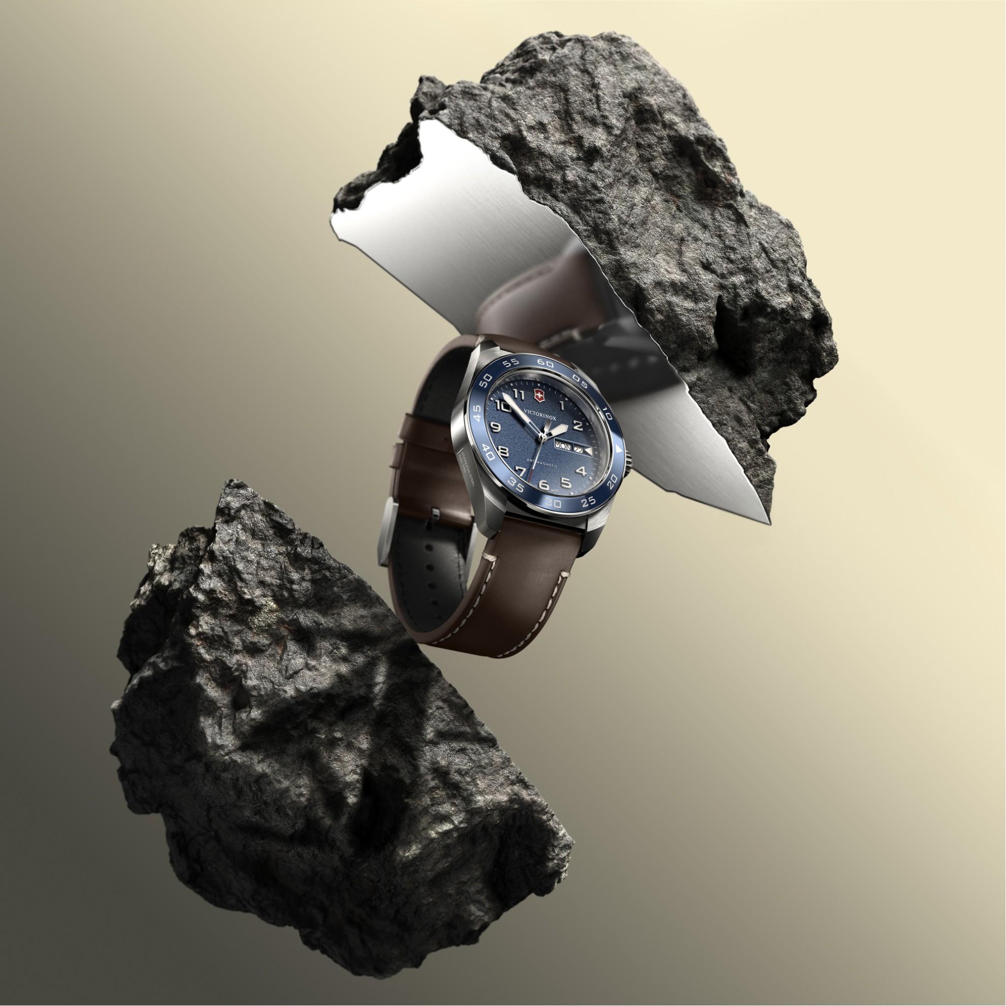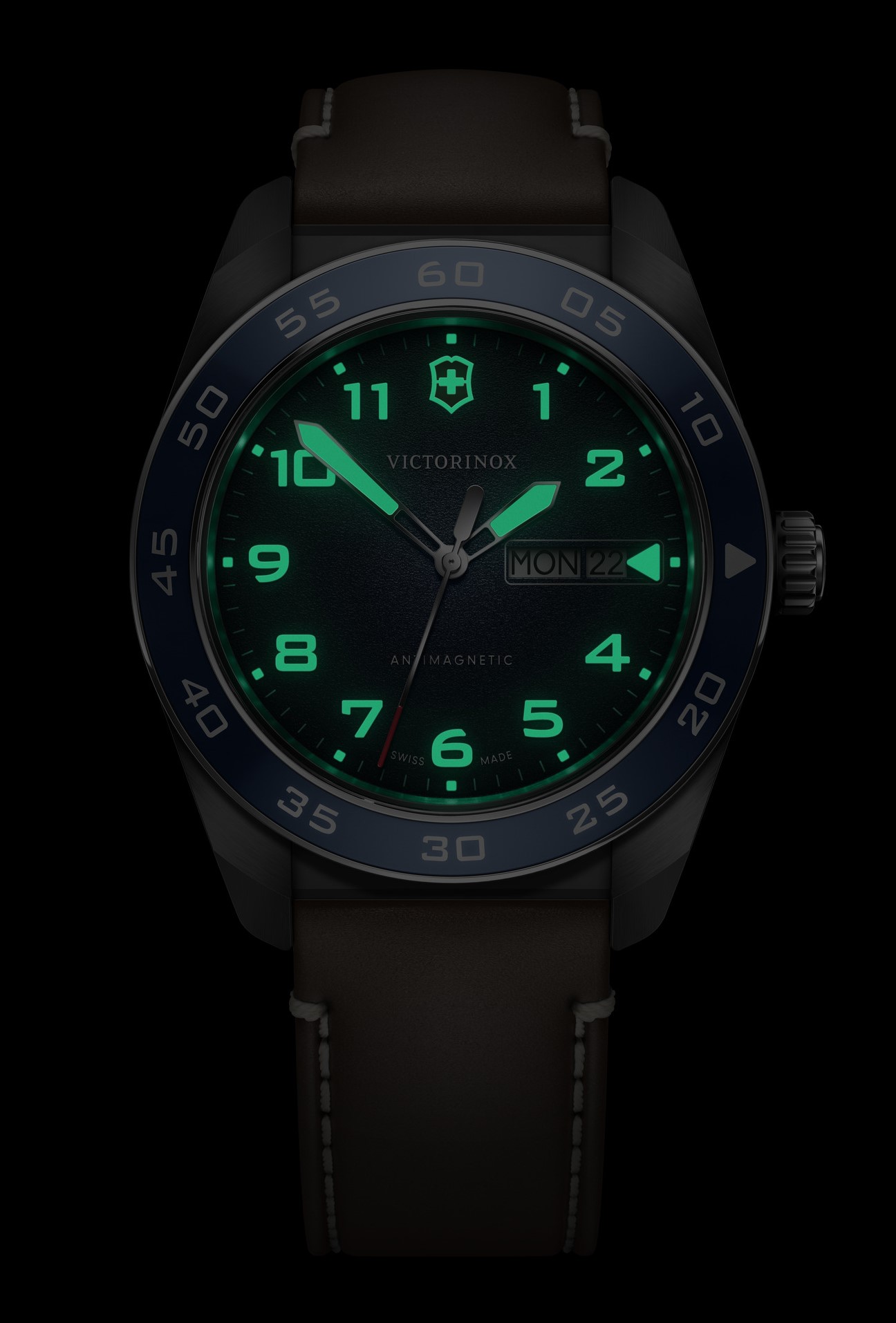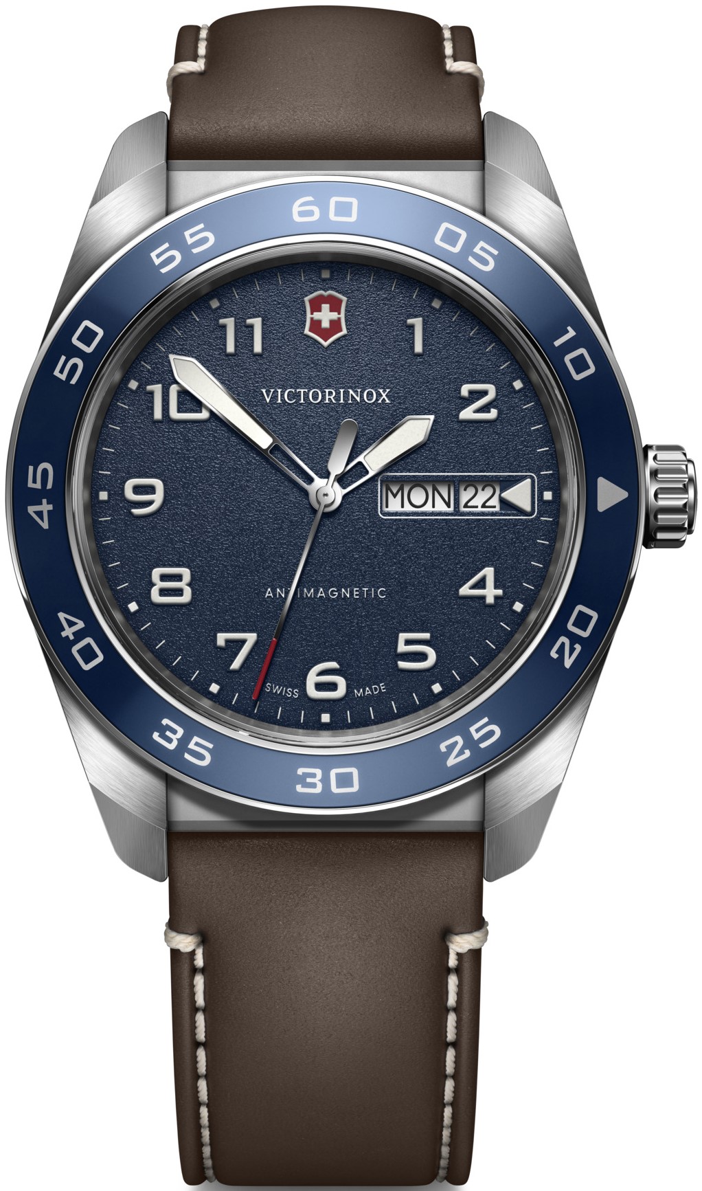 Victorinox Swiss Army 242040 jsou pánské elegantní bateriové hodinky na hnědém koženém řemínku s kontrastním prošíváním a trnovou sponou. Pouzdro z nerezové oceli má průměr 42 milimetrů a modrou lunetu s minutovou stupnicí. Modrý texturovaný číselník s ukazatelem data a dne v týdnu je chráněn odolným safírovým sklem. Ručičky a indexy pokrývá luminiscenční nátěr SuperLuminova®, který po nasvícení garantuje perfektní čitelnost za zhoršených světelných podmínek. Pohon hodinek zajišťuje quartzový strojek Ronda 517. S vodotěsností 10 ATM jsou hodinky vhodné pro plavání a šnorchlování.