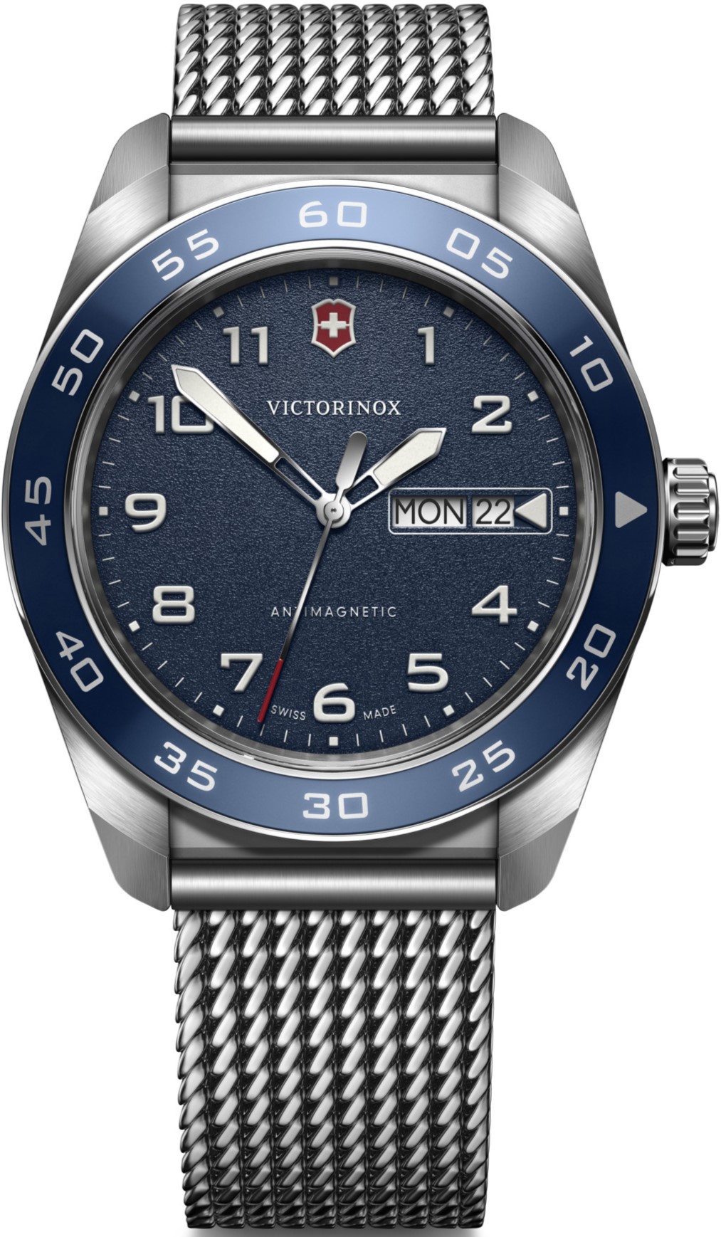 Victorinox Swiss Army 242042 jsou pánské elegantní bateriové hodinky na ocelovém milánském tahu s posuvnou sponou. Pouzdro z nerezové oceli má průměr 42 milimetrů a modrou lunetu s minutovou stupnicí. Modrý texturovaný číselník s ukazatelem data a dne v týdnu je chráněn odolným safírovým sklem. Ručičky a indexy pokrývá luminiscenční nátěr SuperLuminova®, který po nasvícení garantuje perfektní čitelnost za zhoršených světelných podmínek. Pohon hodinek zajišťuje quartzový strojek Ronda 517. S vodotěsností 10 ATM jsou hodinky vhodné pro plavání a šnorchlování.