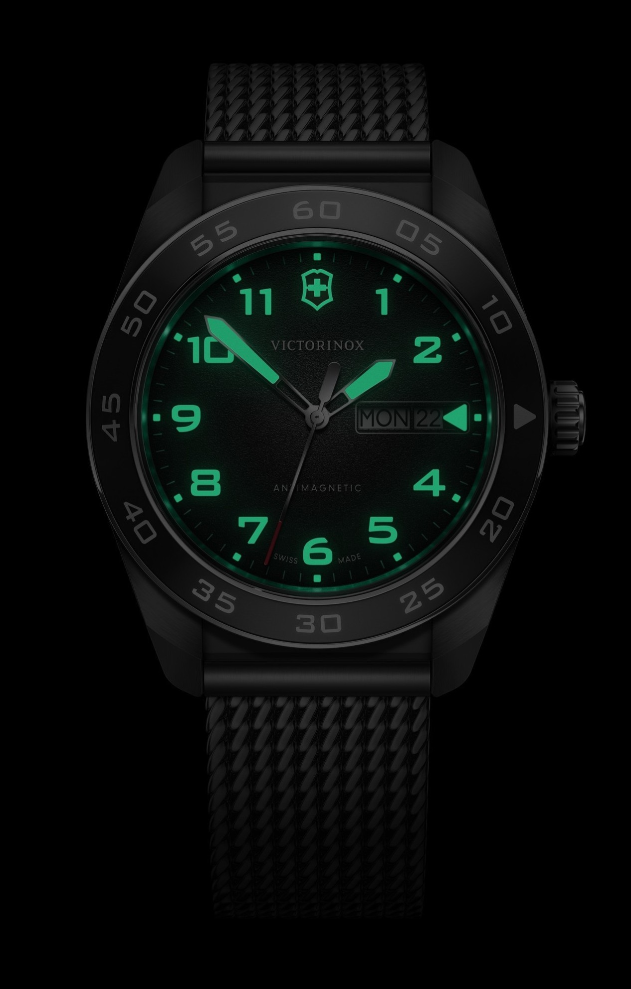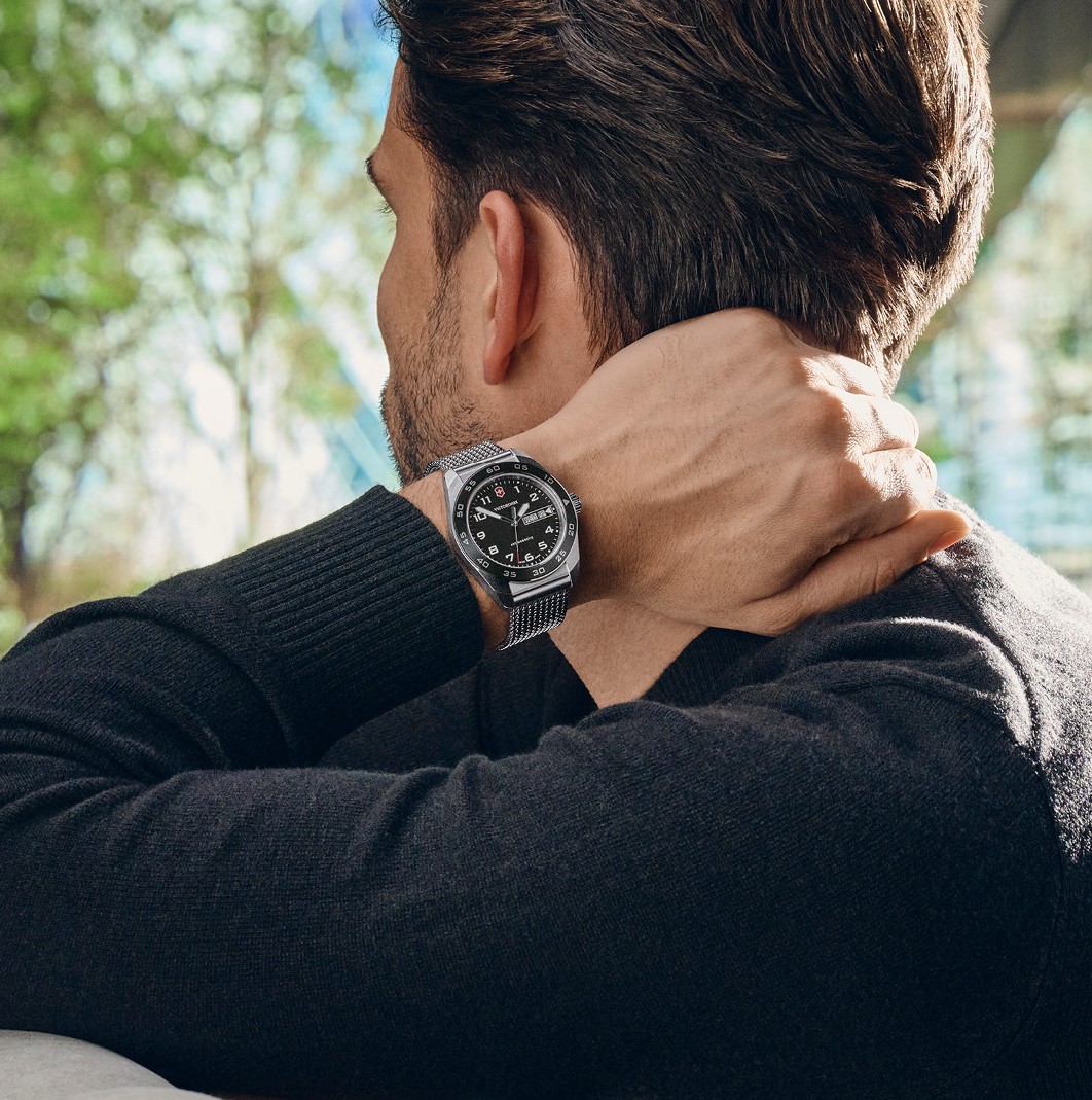 Victorinox Swiss Army 242043 jsou pánské elegantní bateriové hodinky na ocelovém milánském tahu s posuvnou sponou. Pouzdro z nerezové oceli má průměr 42 milimetrů a černou lunetu s minutovou stupnicí. Černý texturovaný číselník s ukazatelem data a dne v týdnu je chráněn odolným safírovým sklem. Ručičky a indexy pokrývá luminiscenční nátěr SuperLuminova®, který po nasvícení garantuje perfektní čitelnost za zhoršených světelných podmínek. Pohon hodinek zajišťuje quartzový strojek Ronda 517. S vodotěsností 10 ATM jsou hodinky vhodné pro plavání a šnorchlování.