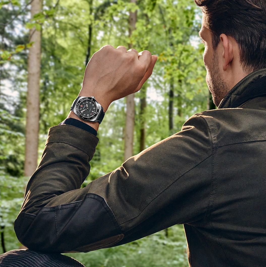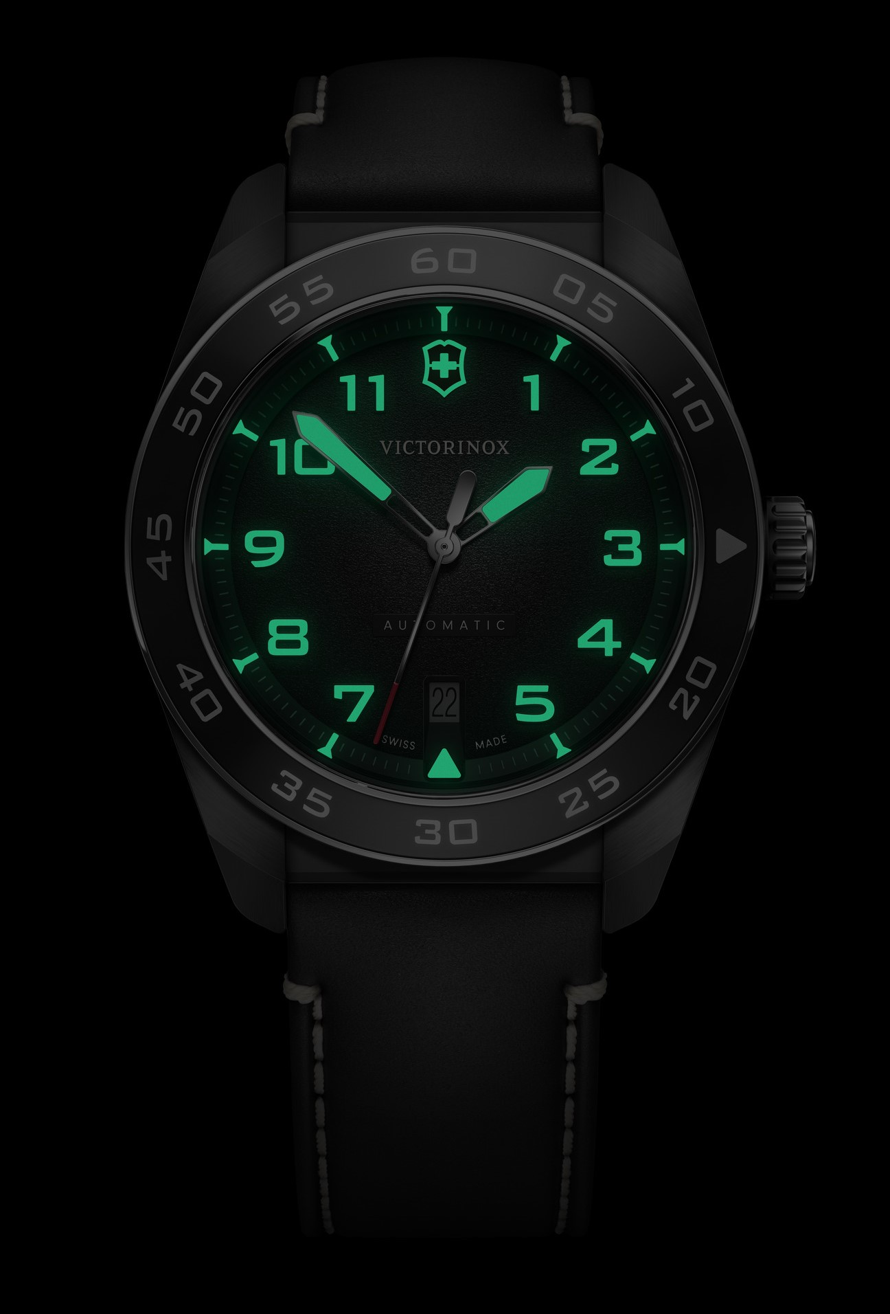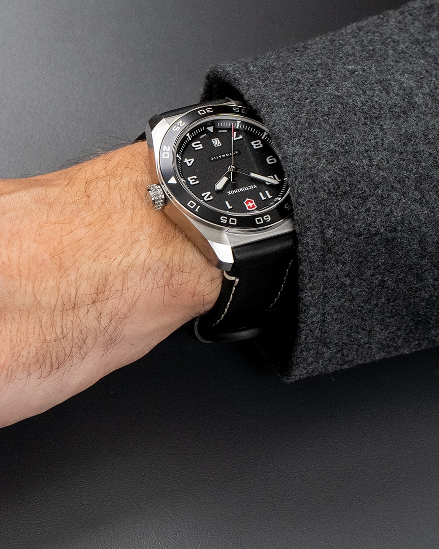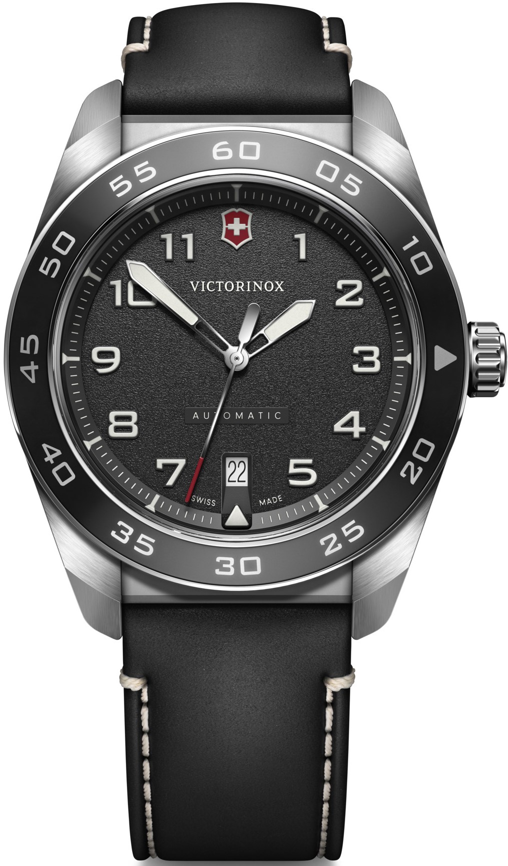 Victorinox Swiss Army Auto 242044 jsou pánské elegantní automatické hodinky na černém koženém řemínku s trnovou sponou. Pouzdro z nerezové oceli má průměr 42 milimetrů, černou lunetu s minutovou stupnicí a průhledné dýnko. Černý texturovaný číselník s ukazatelem data na šesté hodině je chráněn odolným safírovým sklem. Ručičky a indexy pokrývá luminiscenční nátěr SuperLuminova®, který po nasvícení garantuje perfektní čitelnost za zhoršených světelných podmínek. Pohon hodinek zajišťuje mechanický strojek Sellita SW200 s automatickým nátahem a rezervou chodu 38 hodin. S vodotěsností 10 ATM jsou hodinky vhodné pro plavání a šnorchlování.