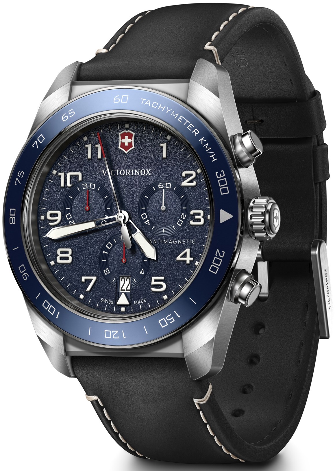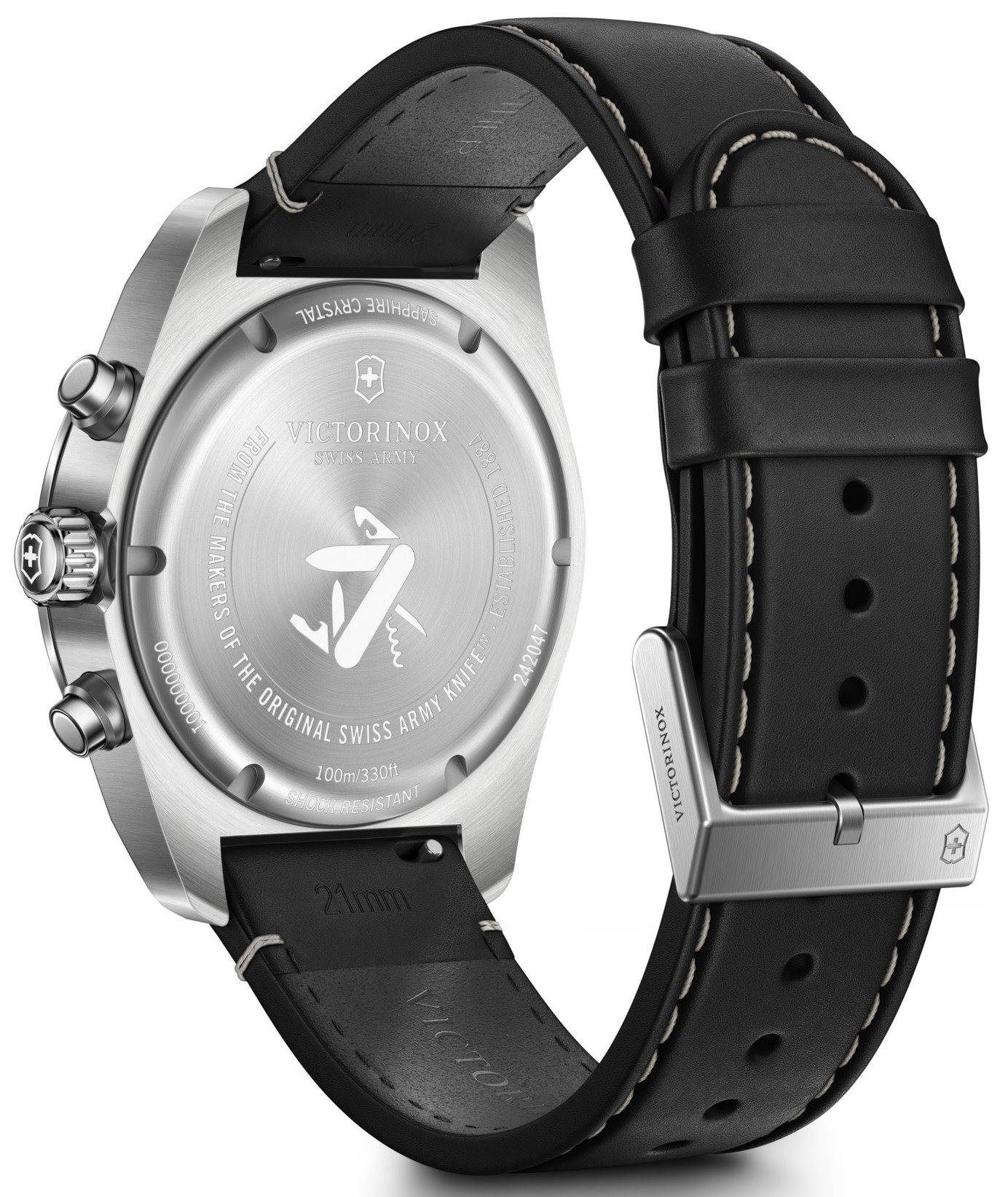 Victorinox Swiss Army Chrono 242047 jsou pánské sportovní bateriové hodinky na černém koženém řemínku s kontrastním prošíváním a trnovou sponou. Pouzdro z nerezové oceli má průměr 42 milimetrů a modrou tachymetrickou lunetu. Modrý texturovaný číselník s ukazatelem data a stopkami je chráněn odolným safírovým sklem. Ručičky a indexy pokrývá luminiscenční nátěr SuperLuminova®, který po nasvícení garantuje perfektní čitelnost za zhoršených světelných podmínek. Pohon hodinek zajišťuje quartzový strojek Ronda 5030.D. S vodotěsností 10 ATM jsou hodinky vhodné pro plavání a šnorchlování.