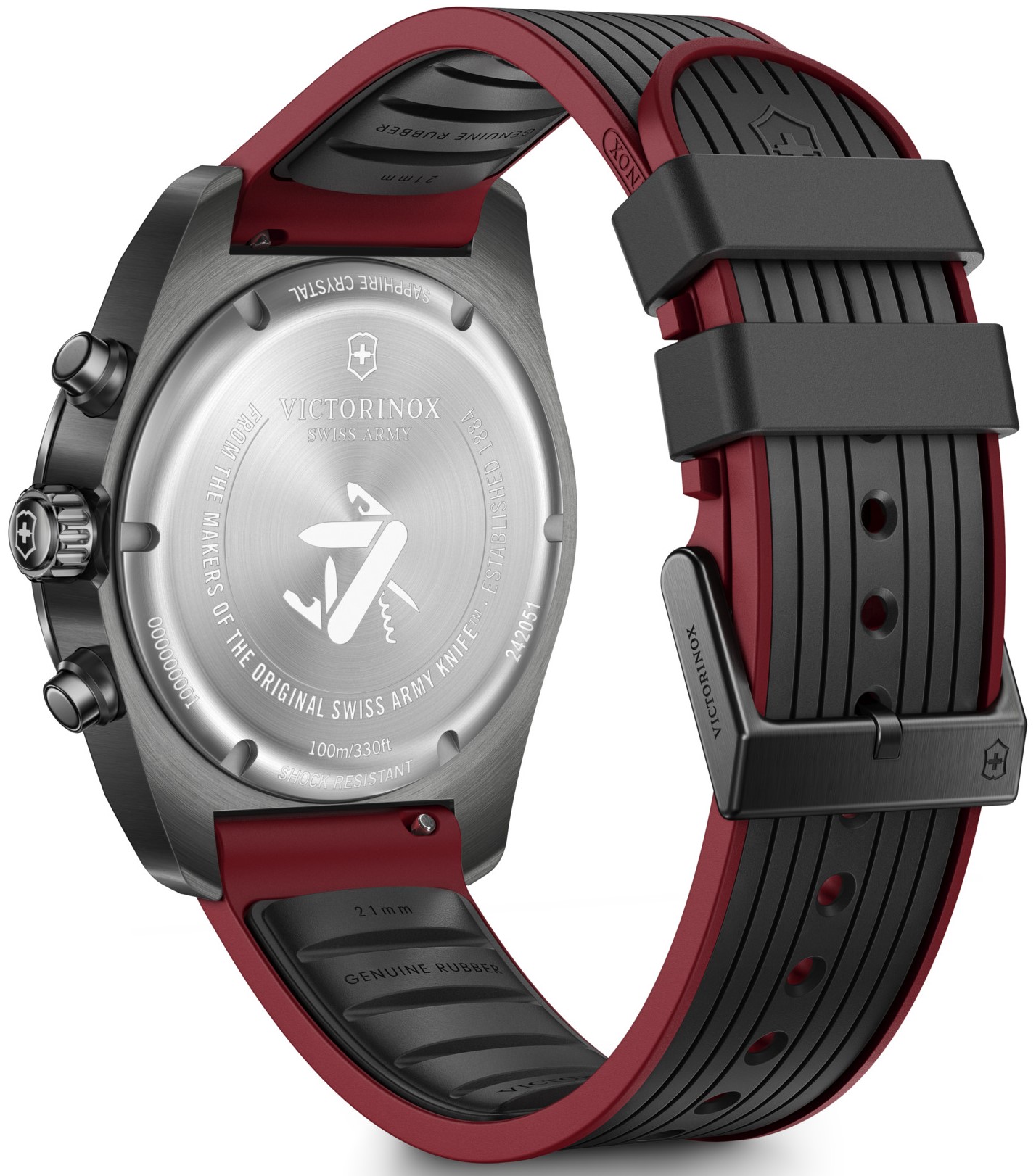Victorinox Swiss Army Chrono 242051 jsou pánské sportovní bateriové hodinky na červeno-černém kaučukovém řemínku s trnovou sponou. Pouzdro z nerezové oceli s povrchovou PVD úpravou černé barvy má průměr 42 milimetrů a tachymetrickou lunetu. Černý texturovaný číselník s ukazatelem data a stopkami je chráněn odolným safírovým sklem. Ručičky a indexy pokrývá luminiscenční nátěr SuperLuminova®, který po nasvícení garantuje perfektní čitelnost za zhoršených světelných podmínek. Pohon hodinek zajišťuje quartzový strojek Ronda 5030.D. S vodotěsností 10 ATM jsou hodinky vhodné pro plavání a šnorchlování.